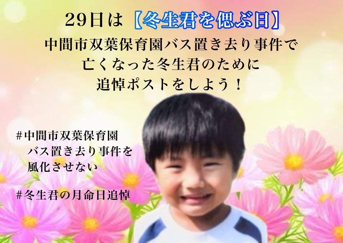 2021年7月29日 中間市双葉保育園の送迎バスに倉掛冬生くん(当時5歳)が閉じ込められ 熱中症で亡くなりました。 #冬生君の月命日追悼 毎月29日に追悼企画を行います。 事件を風化させないために ご協力いただけますと幸いです🙇‍♀️ 冬生君にたくさんのお花を💐 #子供の車内置き去りを防ごう pic.x.com/pTwt1UCz23 x.com/wakasaX0135870…