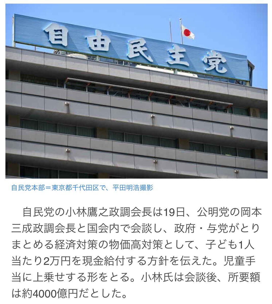 【子供1人当たり2万円給付 自民方針】 news.yahoo.co.jp/pickup/6559507
