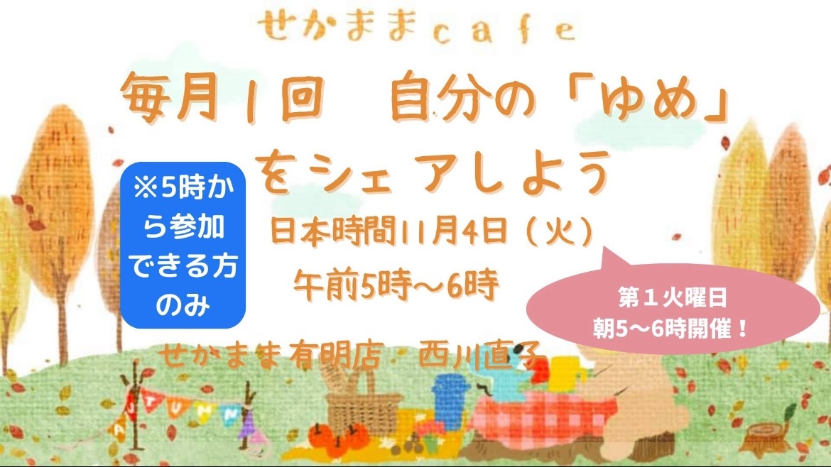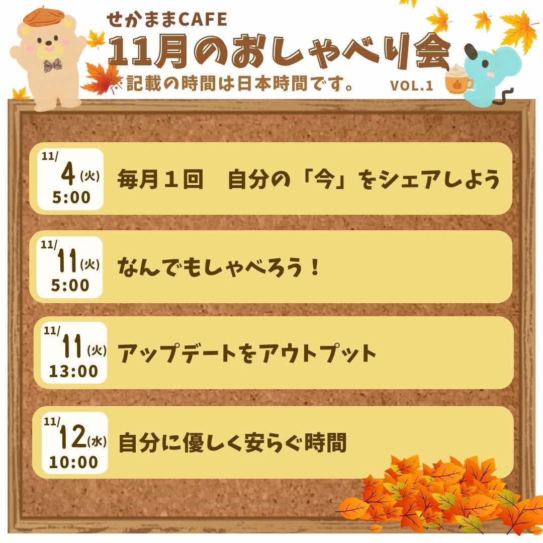 11月も#おしゃべり 会あります。 HPには、#コラム もありますよ。 おしゃべりで少しでもホッとしませんか!? 詳細↓bit.ly/3sisyMq #子育てあるある #お悩み相談 #ママもリラックス #ママ活 #新米ママ #転勤妻 #ワンオペ #日本語でおしゃべり #おしゃべりは世界を救う #せかままcafe