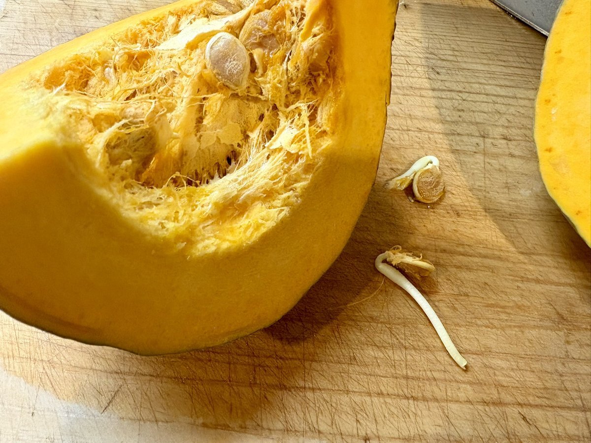 切った瞬間、目が合った気がした👀 かぼちゃを切ったら…中の種が発芽してた😳 野菜って「もう一度生きよう」とするんですね。畑があったら植えてあげたい😂 #かぼちゃ #家庭菜園初心者 #季節の発見 #二拠点生活 #朝ごはん #秋の旬野菜