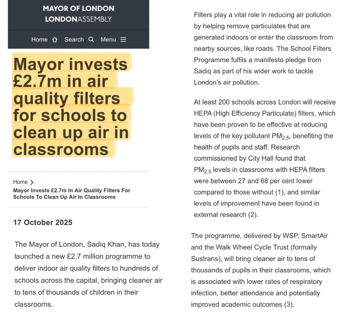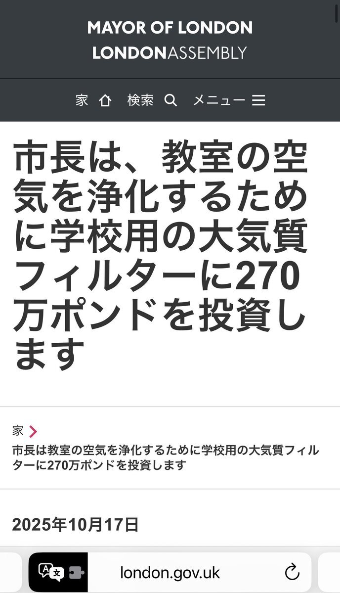 🇬🇧Greater London Authority(大ロンドン庁)公式サイト 2025/10/17 「市長は教室の空気を清浄化するため、学校向け空気清浄フィルターに270万ポンドを投資します」 #感染症から子どもを守れ #後遺症あるぞコロナを無視するな #学校園に空気清浄機を london.gov.uk/mayor-invests-… pic.x.com/KppMDntbyJ