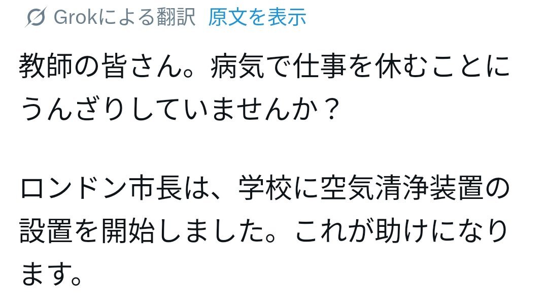 ロンドンの学校では、次々と空気清浄機フィルターが導入されるようです。 日本でもインフルが爆発的に増えていますが、コロナも減っていません。 子供たちが安心して学べる環境を! #後遺症あるぞコロナを無視するな #学校園に空気清浄機を pic.x.com/Qd0nn3ih0z x.com/SadiqKhan/stat…
