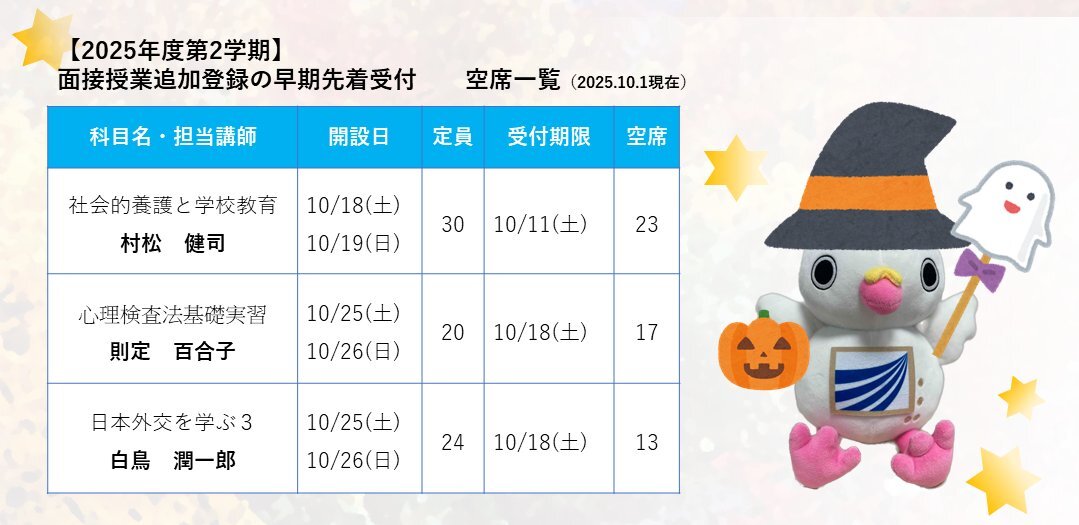 #放送大学 #和歌山学習センター #面接授業 #空席情報 (10/1 PM5:00現在) 授業開始が10/30(木)以前の以下の面接授業3科目について、早期先着受付中です。 詳細は下記の和歌山学習センターウェブサイトをご覧ください! #学校教育 #心理学 #日本外交 sc.ouj.ac.jp/center/wakayam… pic.x.com/kN0hppJpUh