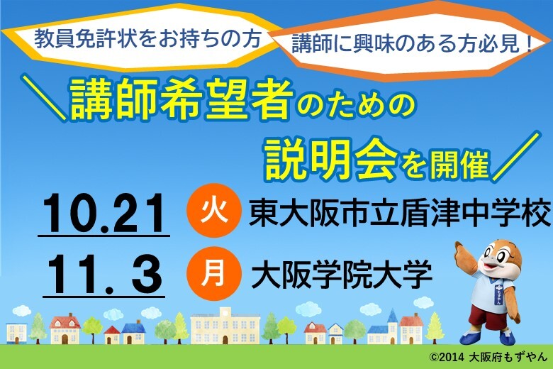 \講師希望者のための説明会を開催!/ 教員免許状をお持ちの方、教職から長く離れて再び教育現場で働きたい方などに向け、#学校見学会 と #教員スタートアッププログラム を実施するで♪ 特に10月21日(火曜日)の学校見学会は、授業・校内見学ができるで!ぜひ参加してな☆ pref.osaka.lg.jp/o180110/kyosho…