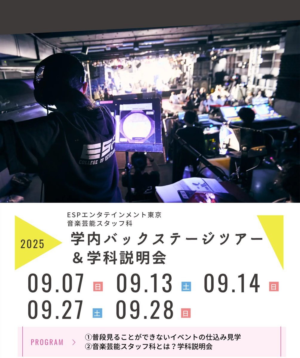 土曜日曜がチャンス! エンタメ業界のスタッフを目指す方、ステージ裏側に興味がある方必見!イベントバックステージツアー&学科説明会を開催! 詳しくは→x.gd/tbZrN #esp学園 #espスタッフ #バックステージツアー #学校見学会 #学校説明会 #個別対応 #入学 #学費 #就職 #個別相談 pic.x.com/qKNihoWruc
