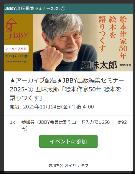 2025年11月14日(金) 16時~32日間アーカイブ配信12月15日16時迄★JBBY出版編集セミナー2025①#日本国際児童図書評議会★#五味太郎「絵本作家50年 絵本を語りつくす」jbbyonline059.peatix.com👈 x.com/taku_oikawa/st… #jvj 昨年同日 #写真絵本『伝え守るアイヌ三世代の物語』著者 #宇井眞紀子 写真展 pic.x.com/hRBzHvsgWk