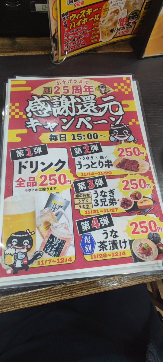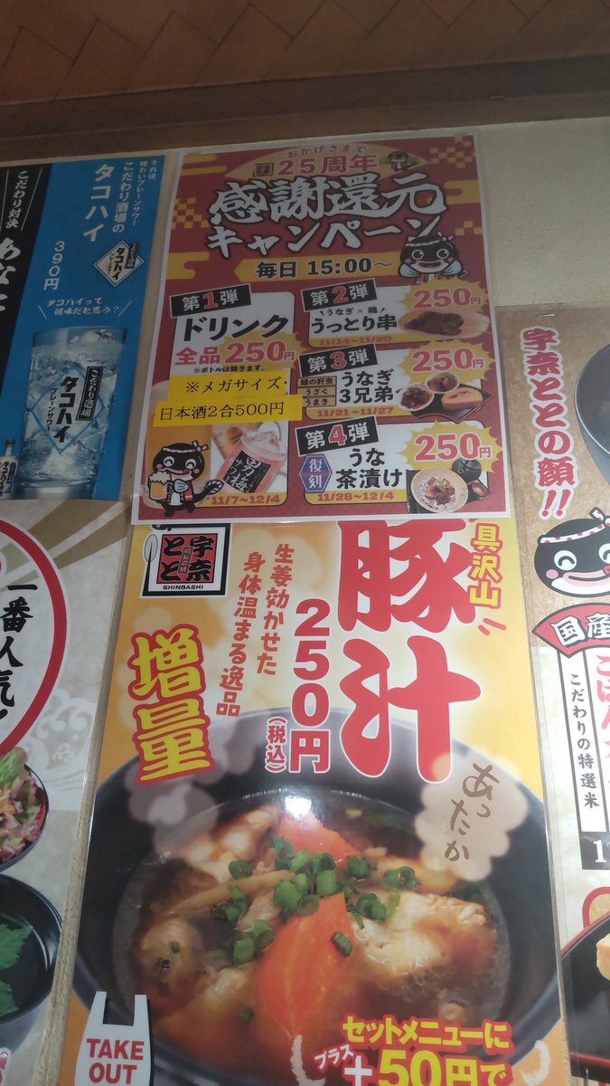 \宇奈とと25周年 感謝祭第3弾!/ 香ばしいふっくらうな串と、ジューシーな焼きとり串が250円で楽しめます!✨ ドリンクは現在もALL250円で提供しておりますので、ぜひおつまみにどうぞ🔥 #宇奈とと25周年 #感謝祭 #うなぎ好きと繋がりたい #カウントダウン #宇奈とと #unatoto #うなぎ #鰻 pic.x.com/EQVDT7q1eg