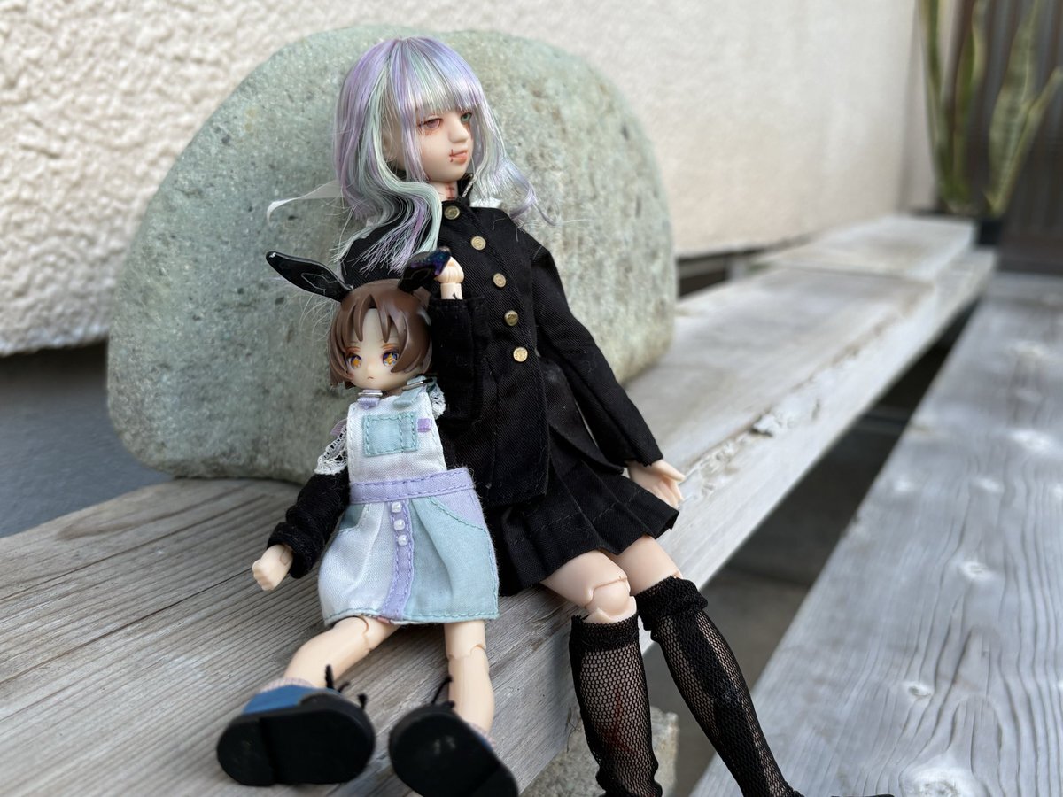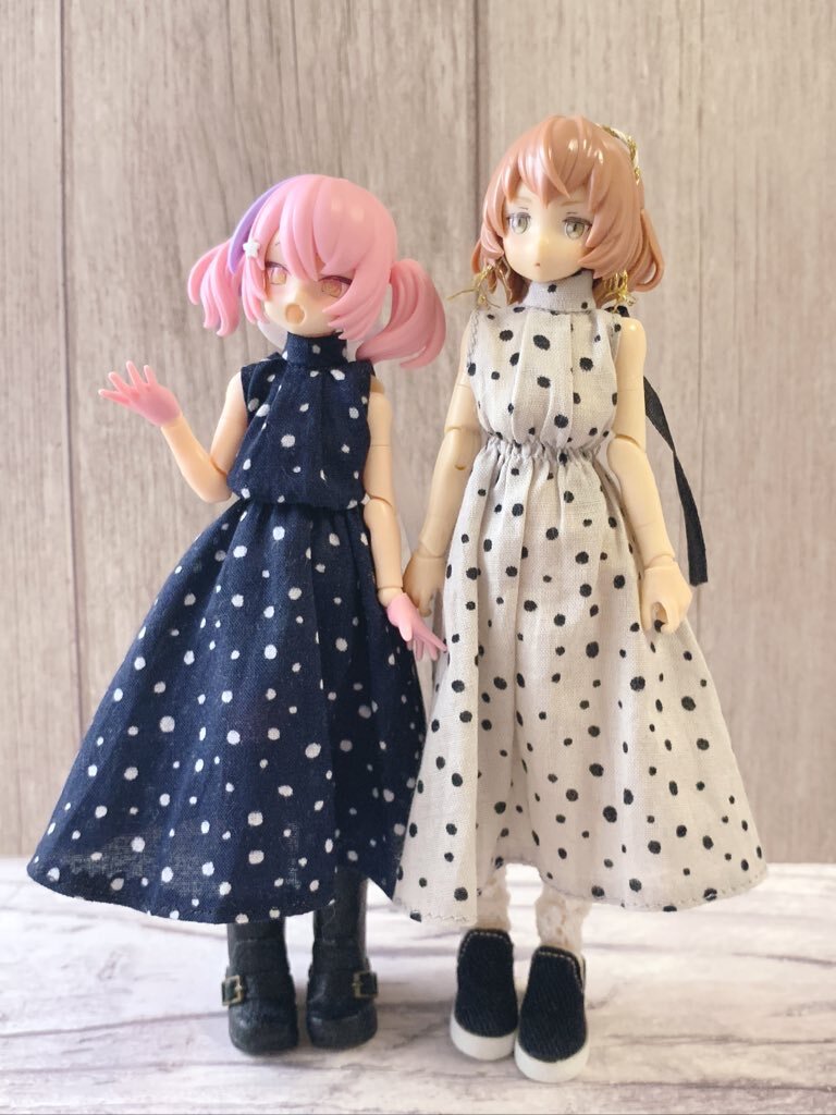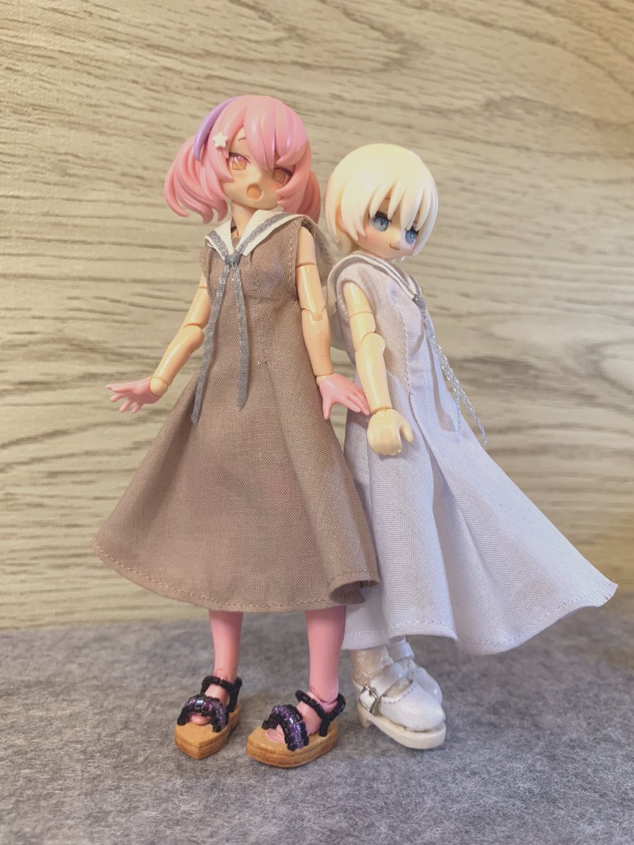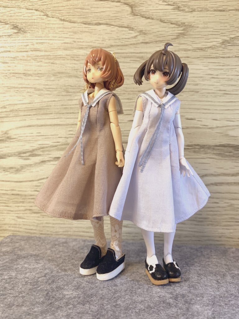 明日のAKG参加します。 3F B15 OOPS セーラー襟付きのフレアワンピースのグレージュカラー(右側の水色はありません)と、バックリボン付シャーリングワンピース(2色)です。 1/12汎用サイズ(メガミのお胸Mサイズ以下)プニモフや宇宙うさは長めですが着用できます。 #AKG28 #メガミデバイス #宇宙うさ pic.x.com/Ntmc8rnyI9