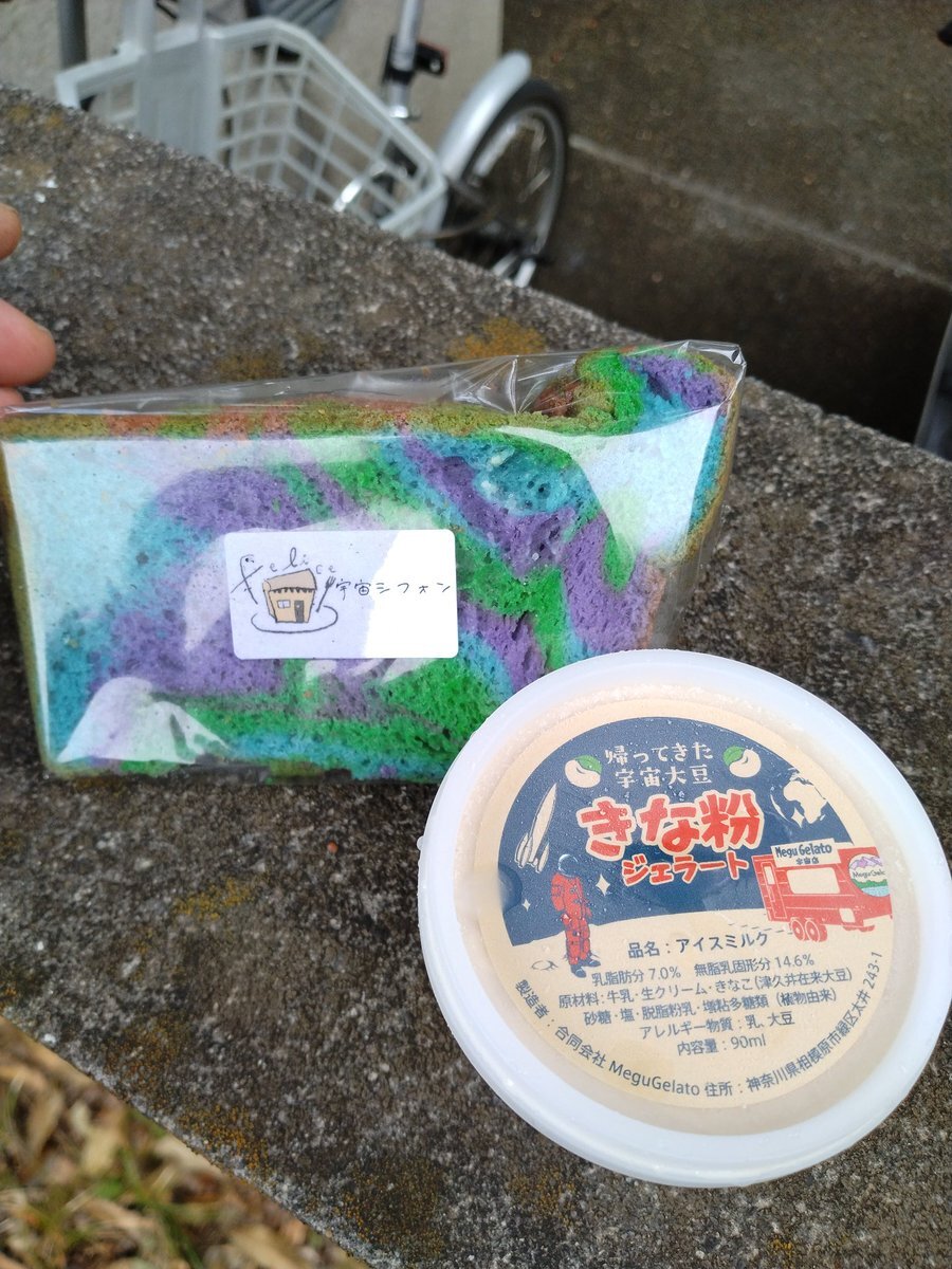 会場をまわったあとはおやつタイム フェリーチェの「宇宙シフォン」とメグジェラートの「きな粉ジェラート」 宇宙って美味しいねw #宇宙交差天 #フェリーチェ #メグジェラート pic.x.com/4MjsVhI0Hq