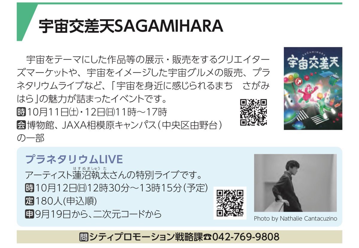 宇宙がテーマのイベント! 「宇宙を身近に感じられるまち さがみはら」って標語としては長くない? #相模原市 #広報さがみはら #宇宙交差天SAGAMIHARA pic.x.com/NcaZrw3l8t