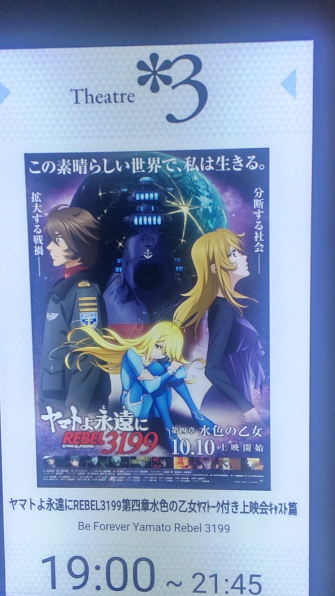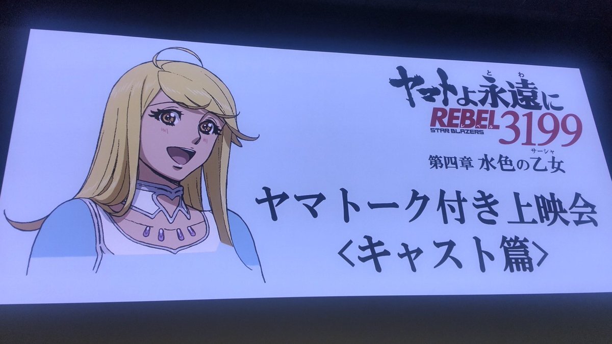本日ラスト、新宿ピカデリーにて『ヤマトよ永遠に REBEL3199 第四章 水色の乙女(サーシャ)』、〈ヤマトーク付き上映会~キャスト篇~〉に乗艦します! #宇宙戦艦ヤマト #宇宙戦艦ヤマト3199 pic.x.com/fPVySqQAax