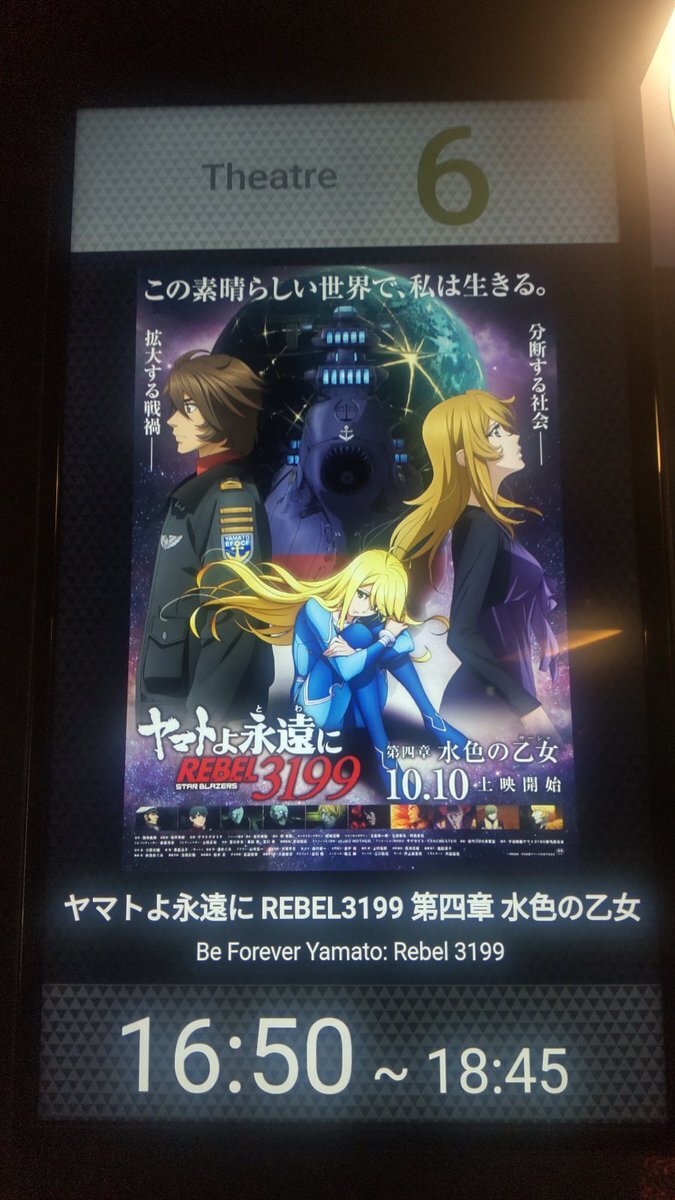 本日ラスト、『ヤマトよ永遠に REBEL3199 第四章 水色の乙女(サーシャ)』、新宿ピカデリーでの最後の航海(公開)に乗艦します! 一番後ろの“AKRacing BOX シート”を取りたかったんだけど、ムビチケではこのシートの予約は出来なかったので、通常シートで。 #宇宙戦艦ヤマト #宇宙戦艦ヤマト3199 pic.x.com/IqXb7j4d8R
