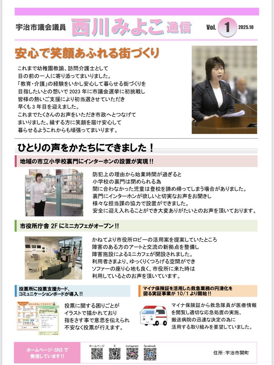 西川みよこ通信が完成しました! 皆様のご支援により議員3年目を迎え いつも励まして下さりありがとうございます🙇‍♀️ 様々なご相談やご要望が、かたちとなり 嬉しいお喜びの声をいただいております。 これからも皆様の想いに寄り添い誠実に 頑張って参ります😊 #宇治市議会議員 #西川みよこ #公明党 pic.x.com/fQr1B4XsgO