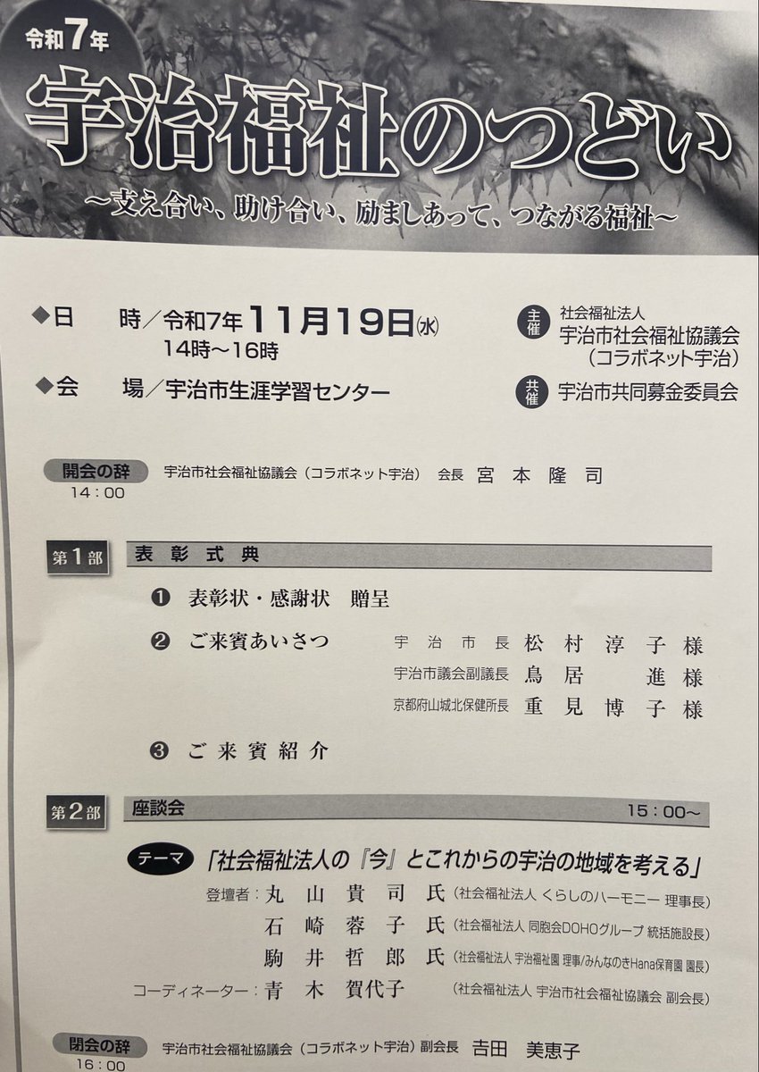 昨日は「宇治福祉のつどい」が開催されまして、宇治市議会を代表致しまして、祝辞を述べさせて頂きました。永年にわたり学区福祉やボランティア、福祉施設などで、地域福祉にご貢献くださいました方々への表彰がございました。#とりい進 #地域福祉 #宇治市議会議員 pic.x.com/2GcCM4dHfi
