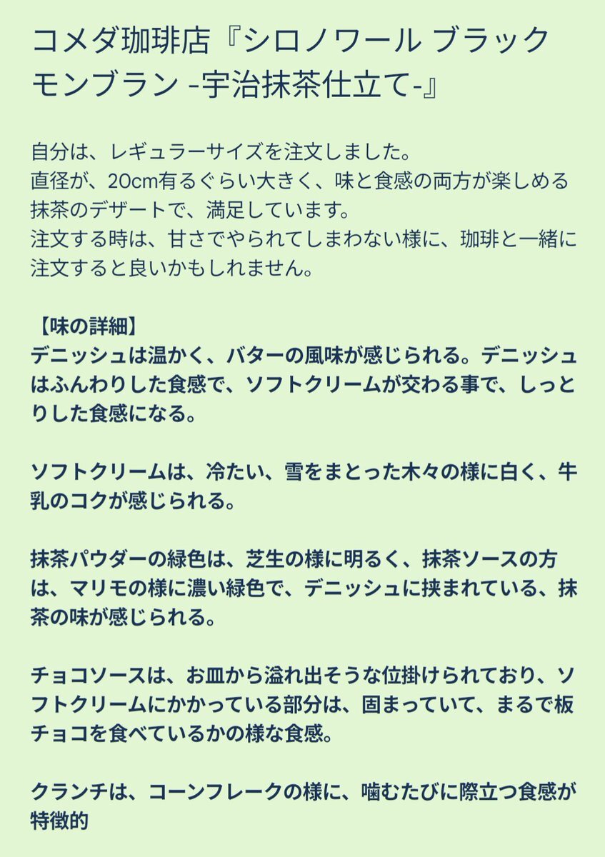 今日は、コメダ珈琲店で、期間限定のシロノワールを頂きました。 折角の外食、お金を出していただく料理なので、自分はその料理を味わいながら、自分が感じた事を言語化して書き残さないと、気が済まなくなりました。 #抹茶 #宇治抹茶 #抹茶スイーツ #コメダ珈琲店 #シロノワール #ブラックモンブラン pic.x.com/hZa6OZH1lB