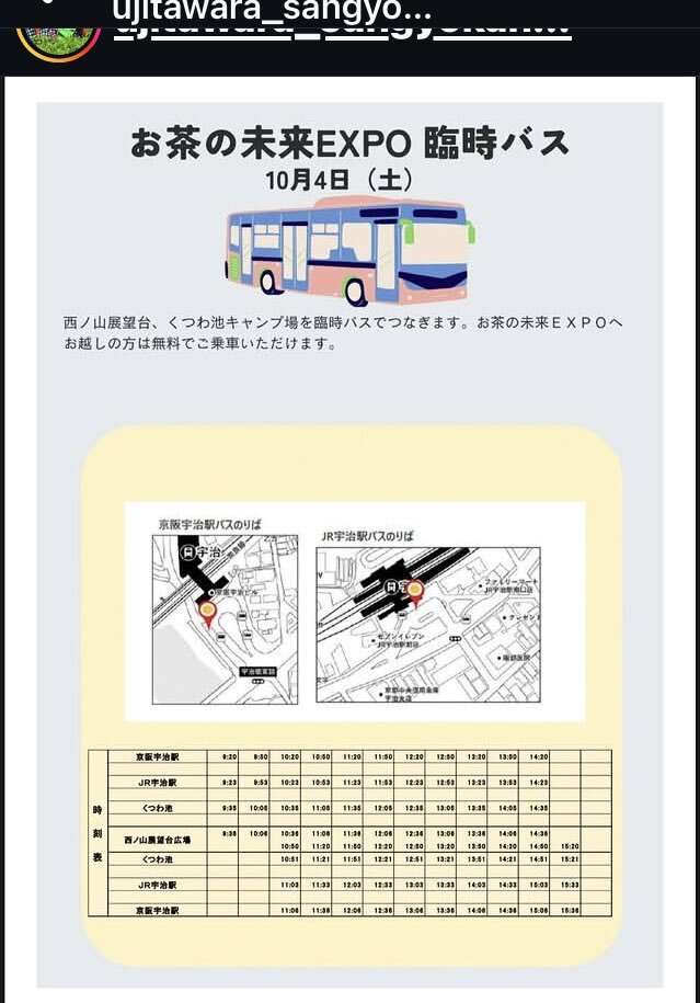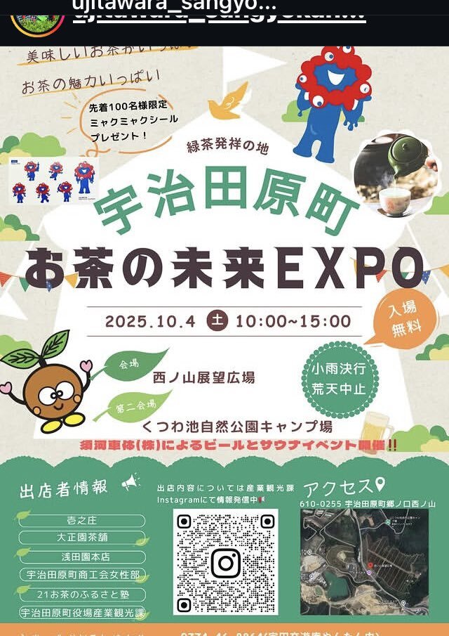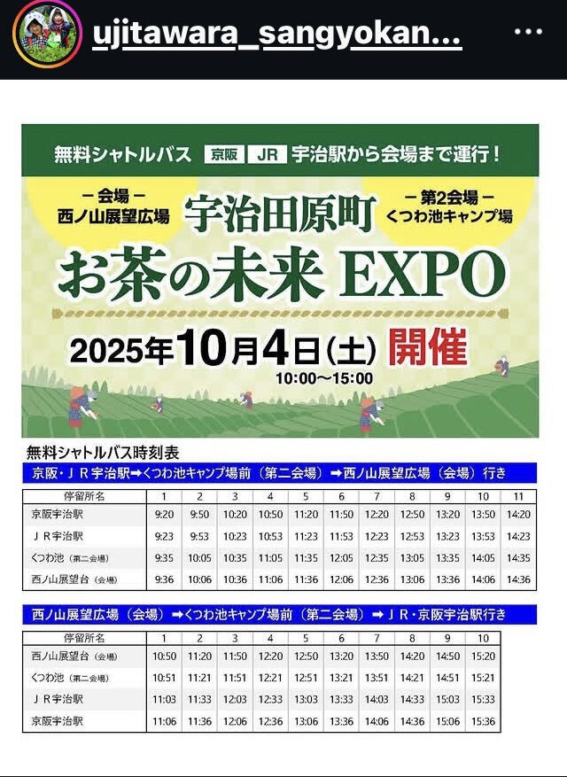 🍵🍵🍵宇治田原町 お茶の未来EXPO🍵🍵🍵 2025/10/4(土)10:00-15:00 202/10/4(土) 10:00-15:00 入場無料🆓 @西ノ山展望台広場 @くつわ池キャンプ場(須河車体によるビール🍺サウナイベント) #永谷茶門さん出演 #お茶の未来EXPO ※臨時バス有り🚌(無料🆓) #京阪宇治駅 #JR宇治駅 #宇治田原 pic.x.com/Tat640Js3q