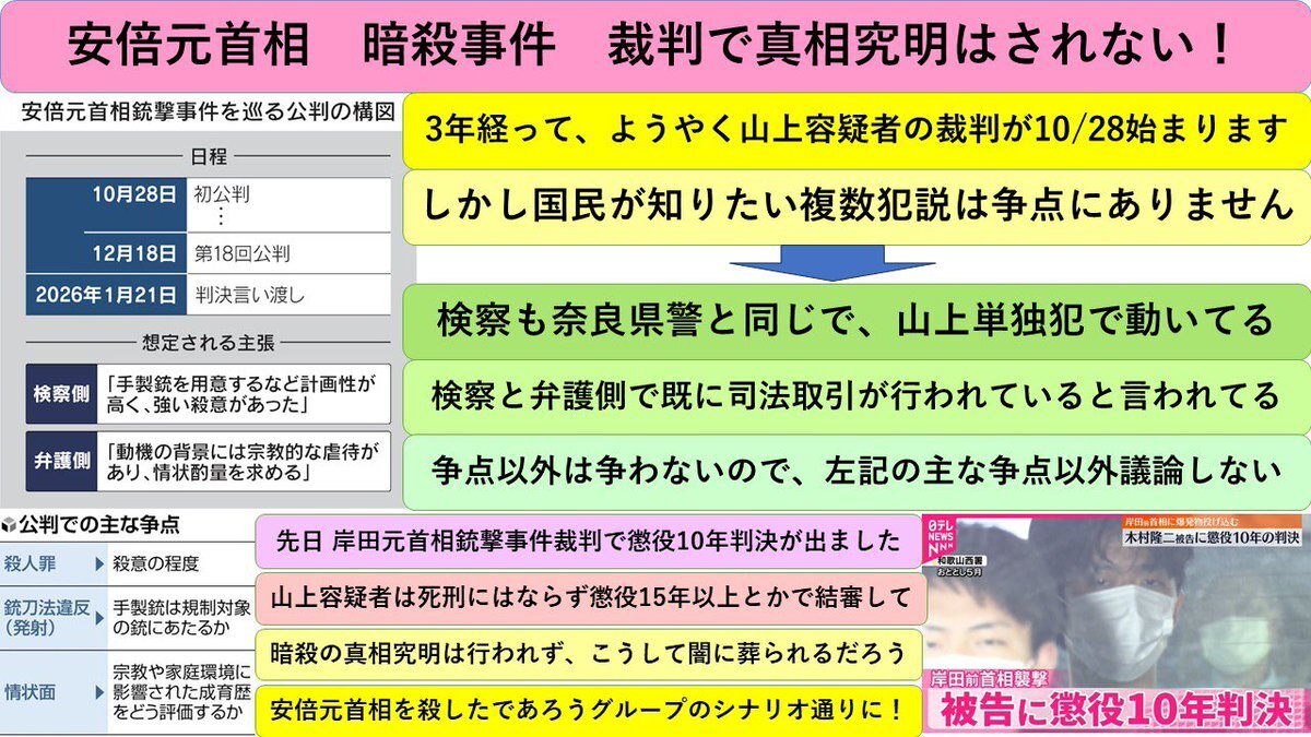 安倍元首相暗殺事件の真相究明は 裁判では行われない‼️ 事件から3年が経ち、ようやく10月28日に初公判が始まりますが 国民の多くが知りたいのは、あまりにも多い疑惑や、複数犯説や謎の数々 しかし、裁判ではそこは争点では無いので、無視され山上の刑を決めるだけ
