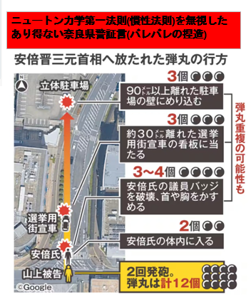 この図に至っては、怒りを覚えます。山上の銃弾が、この一直線上にはない。 「直径9ミリほどの鉛玉6個を一度に発射できる手製銃」は撃った山上自身が吹っ飛んでしまうのは常識で米国でも実証された。 未曾有の茶番裁判を糾弾し、茶番裁判関係者を追い込もう。