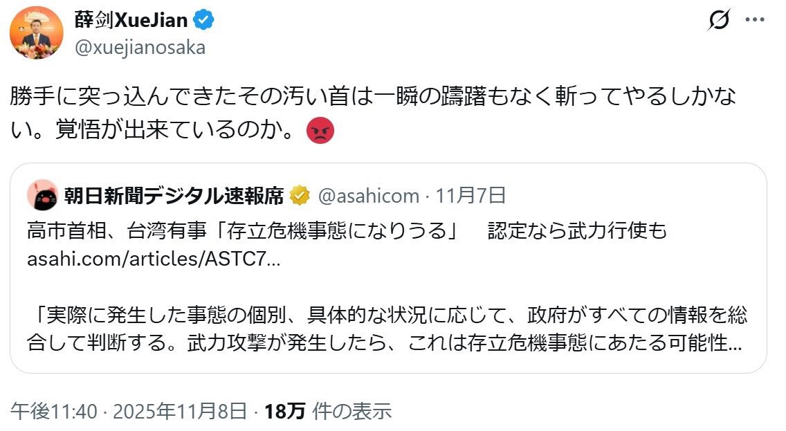 【卑劣な確信犯、今回だけでなく過去の言動も常軌を逸している。完全にペルソナ・ノン・グラータ(好ましからぬ人物)で国外退去にすべき】 毅然とした対応すべき。また繰り返す ↓ 中国の大阪総領事「その汚い首は斬ってやるしかない」 高市首相の台湾有事巡る答弁に投稿 sankei.com/article/202511…
