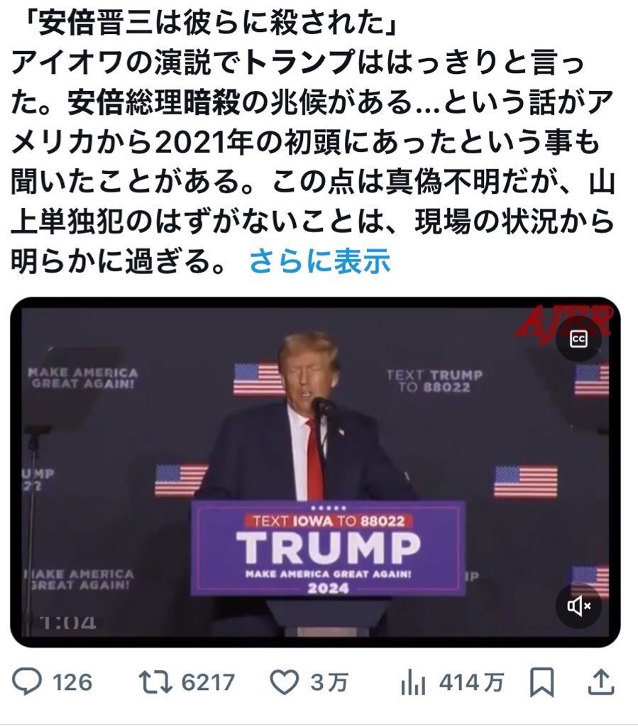 返信先:@YahooNewsTopics茶番💢 🇺🇸#トランプ大統領 『安倍晋三は #彼ら に殺された‼️』 #山上徹也は空砲 ⬅️ #安倍元総理暗殺事件の究明 ⬅️ #安倍元総理暗殺の真相究明 ⬅️ 「 #安倍晋三 は彼らに殺された」 演説でトランプははっきりと言った #安倍総理暗殺 の兆候があると‼️ x.com/gatapi21/statu…