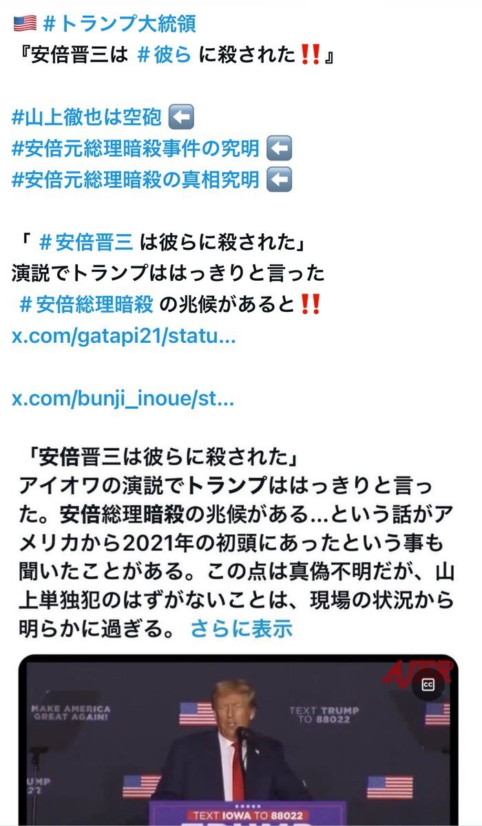 返信先:@Sankei_news#山上徹也は空砲 ⬅️ #安倍元総理暗殺事件の究明 ⬅️ #安倍元総理暗殺の真相究明 ⬅️ 🇺🇸#トランプ大統領 『安倍晋三は #彼ら に殺された‼️』 「 #安倍晋三 は彼らに殺された」 演説でトランプははっきりと言った #安倍総理暗殺 の兆候があると‼️ x.com/gatapi21/statu…