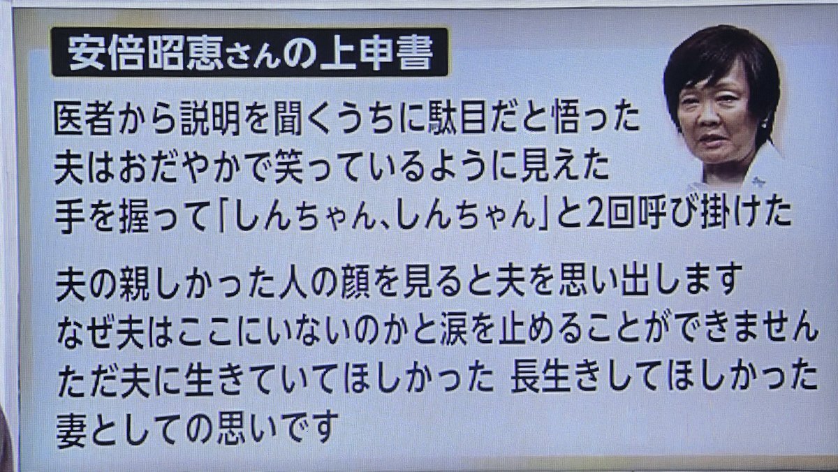兄を失いました。同時に日本にとりかけがえのないリーダーを失いました。 テロによる民主主義への冒涜、暴力による言論封殺が行われてしまいました。 兄は日本を愛し、この国を守る為、政治に命を賭けてきました。 遺された者達は皆分かっています。 お疲れ様でした。ありがとう。 今はただ安らかに。