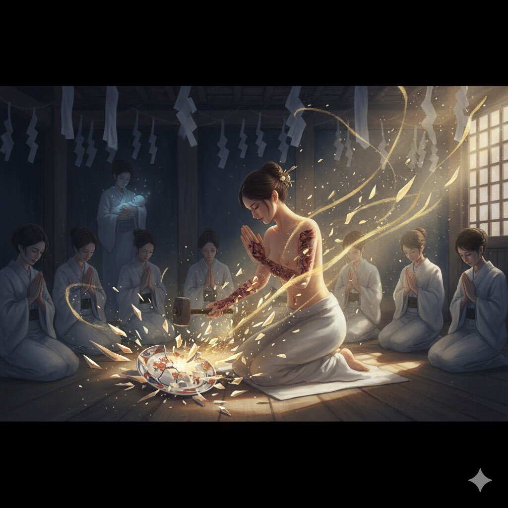 安産のご祈祷は巫女が上半身裸で皿を割る術式が鎌倉時代では主流でした。邪気を払い清める為呪術者が清浄な姿で神の力を借り、穢れを身に受けないようにしたのです。 皿割りは、割れる皿に出産の苦痛や災厄を「身代わり」として押し付けその音で魔を祓う呪術で当時の切実な祈りの形でした🙏 #安産祈願 pic.x.com/vitGNlG0sv