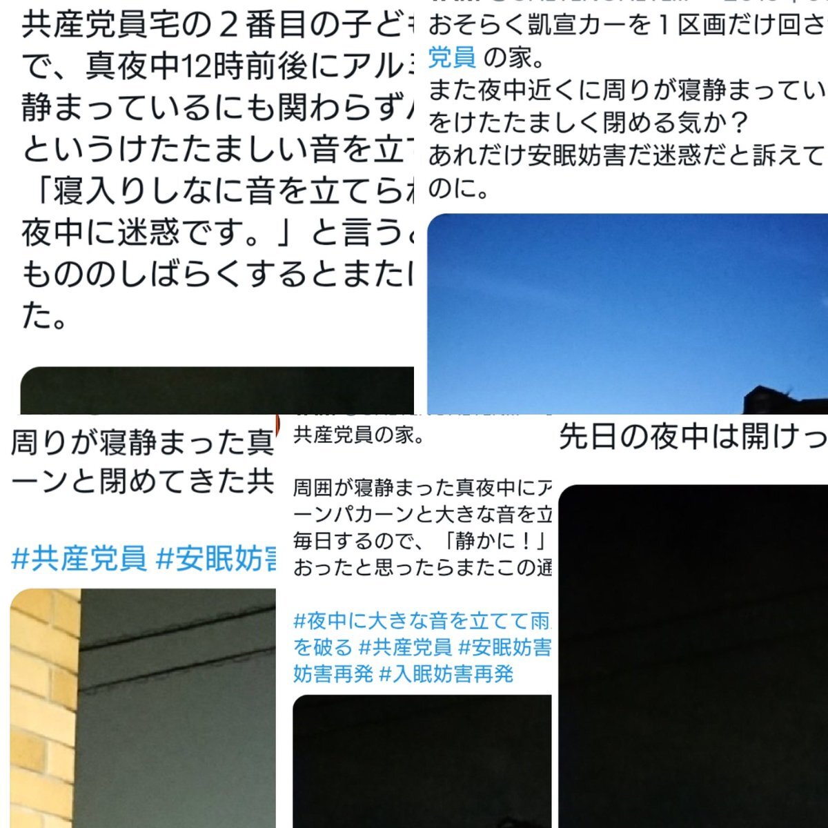 #共産党員 の #安眠妨害 とそれへの注意指摘により逆ギレ #報復 により睡眠不足が連日 己等が人の眠りを破っているも注意されると報復し、殊更大きな音を立てたり、#赤いカーテン を設えたり、#街宣カー を回し寄越したり、#ポスティング して脅すか #複雑性PTSD を負わせ #狂い死に させる企て