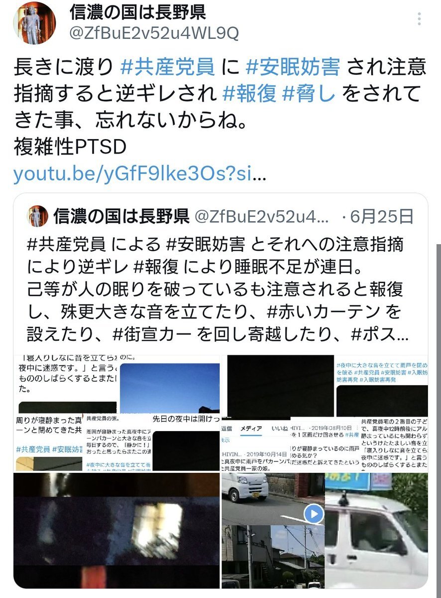 #共産党員 の #安眠妨害 とそれへの注意指摘により逆ギレ #報復 により睡眠不足が連日 己等が人の眠りを破っているも注意されると報復し、殊更大きな音を立てたり、#赤いカーテン を設えたり、#街宣カー を回し寄越したり、#ポスティング して脅す #複雑性PTSD を負わせ #狂い死に させる企て x.com/ZfBuE2v52u4WL9…
