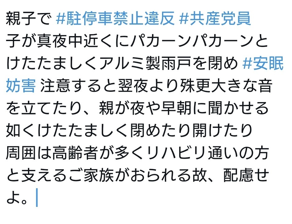 #共産党員 アルミ製雨戸を突拍子も無い時に開けると真夜中迄開っ放し周囲寝静まるも喧しくパカーンパカーンと喧しい閉め #安眠妨害 寝入りしなに迷惑だと注意すると #殊更大きな開閉音 #赤カーテン #街宣カー #ポスティング で #脅す 睡眠不足 #ノイローゼ はこちら #狂い死に #自殺 させる気か? x.com/ZfBuE2v52u4WL9…