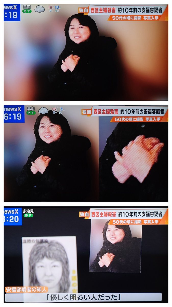 目撃証言の絵と同じポーズで微笑む殺人犯。 絵と異なり傷は右手か?だとすると罪を隠すポーズを自然のうちにとってしまう哀れ・・ ※ツバのない刃物で人を刺すと自分の手も切れてしまうそうで、犯人は右利きということか。 名古屋市西区主婦殺害事件 安福久美子容疑者