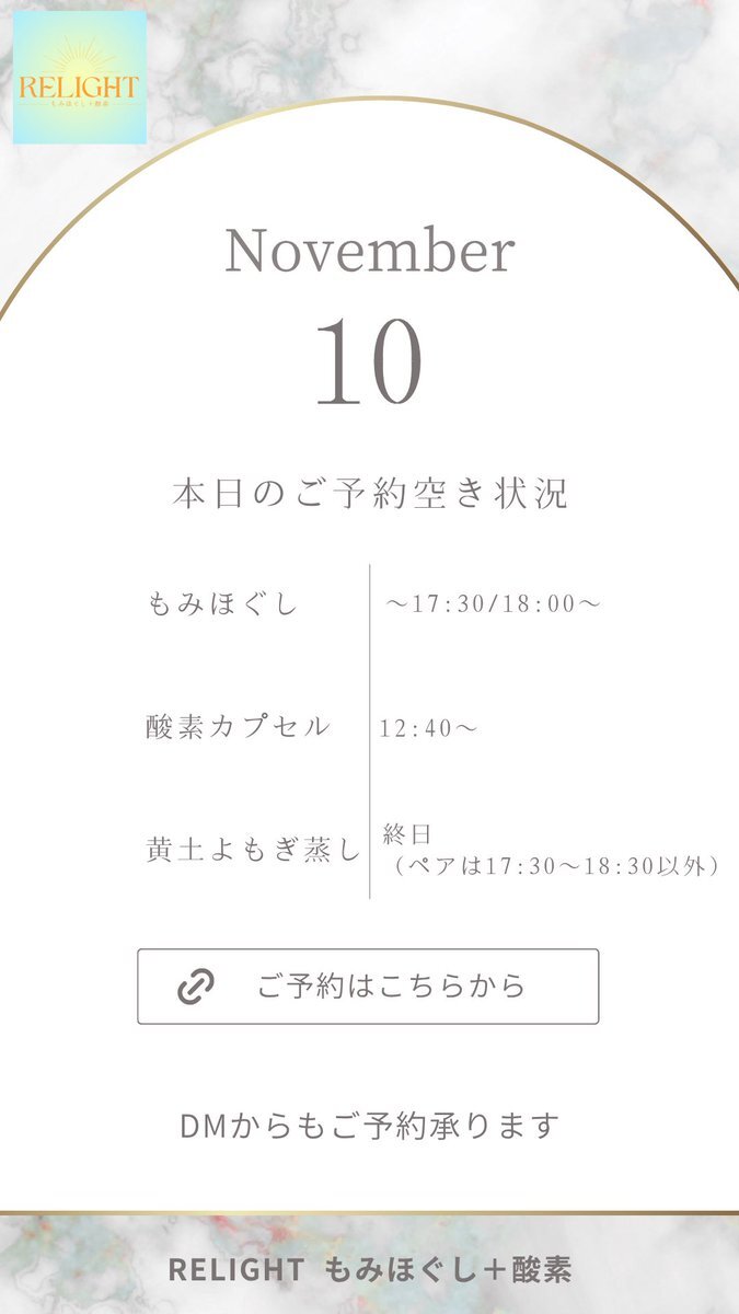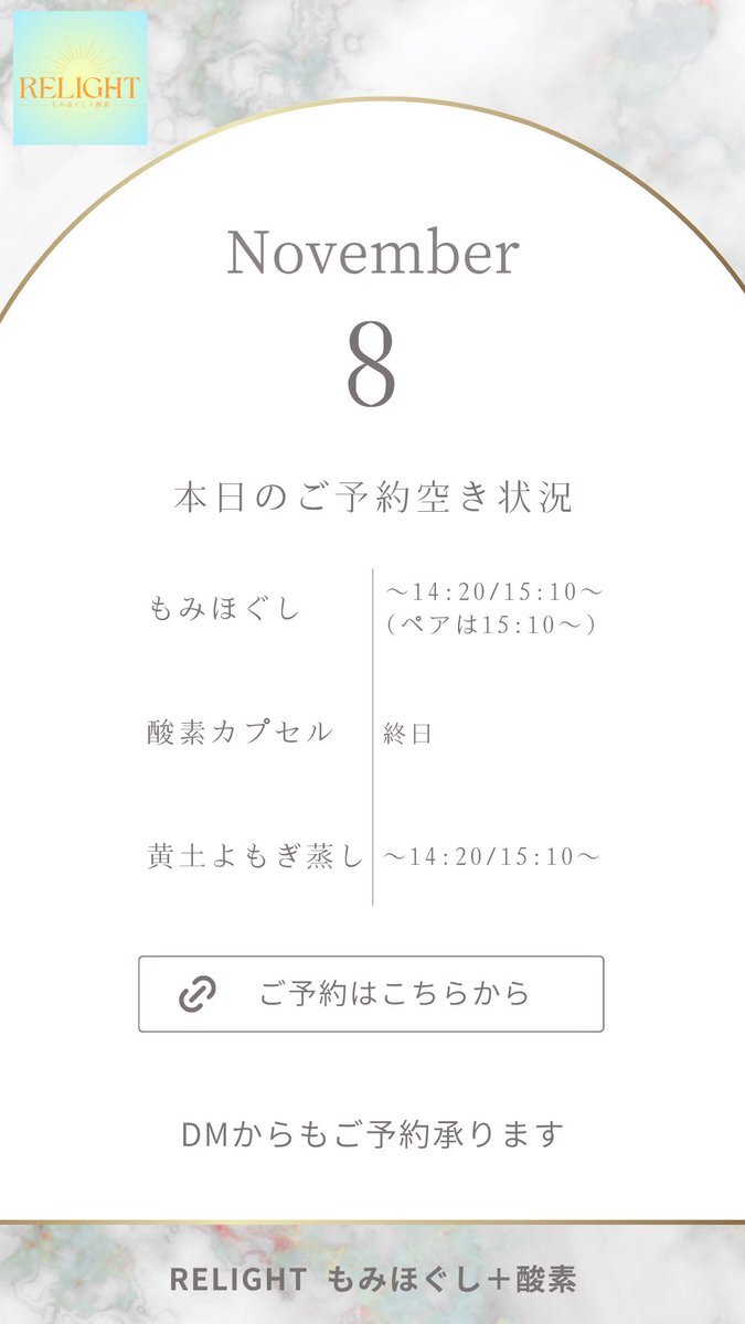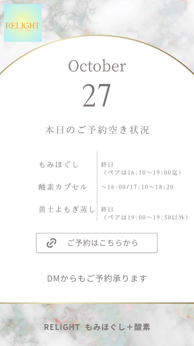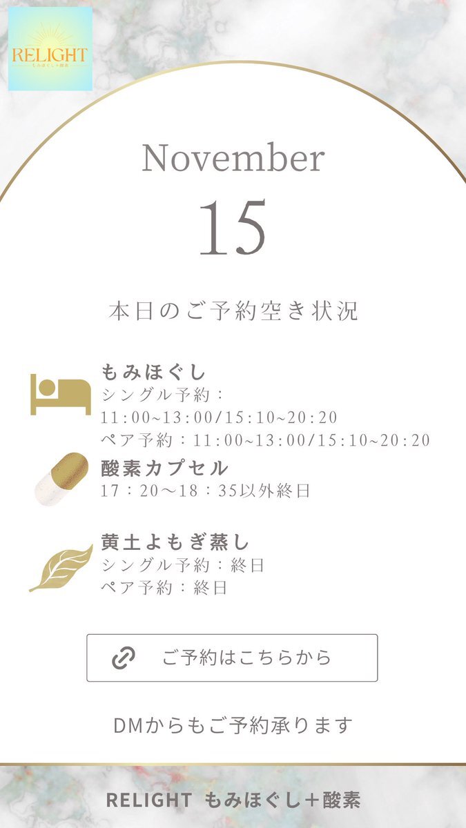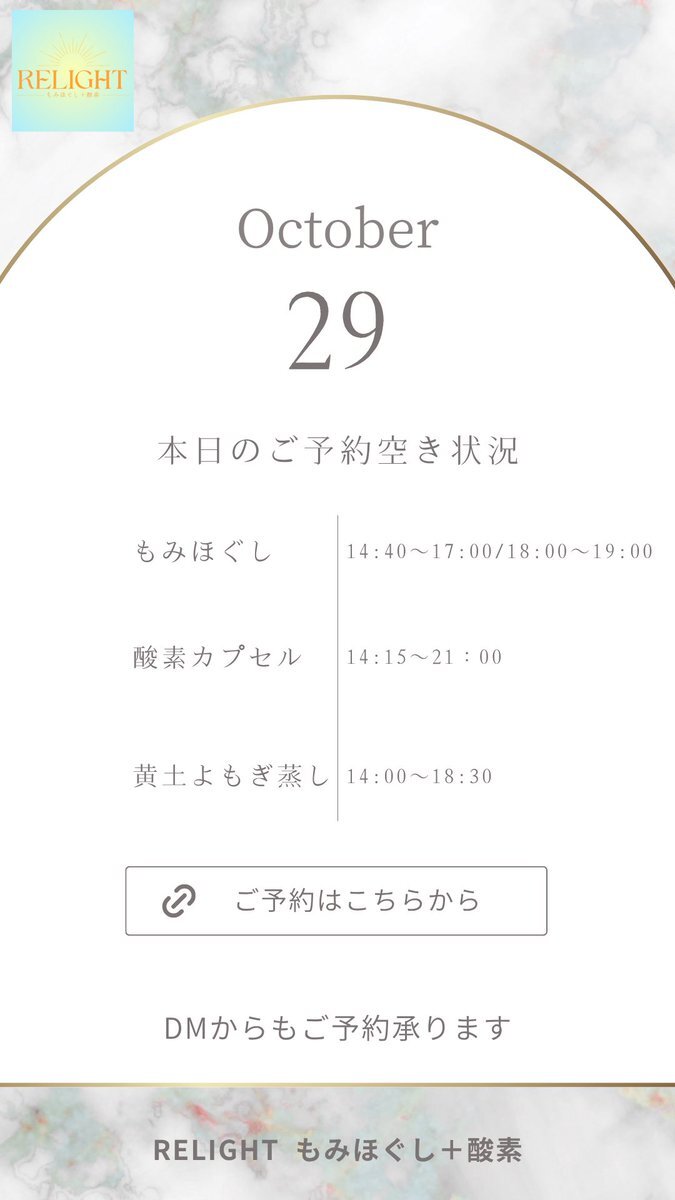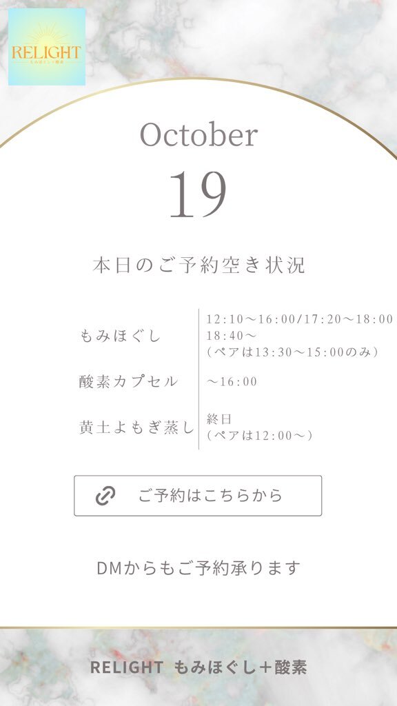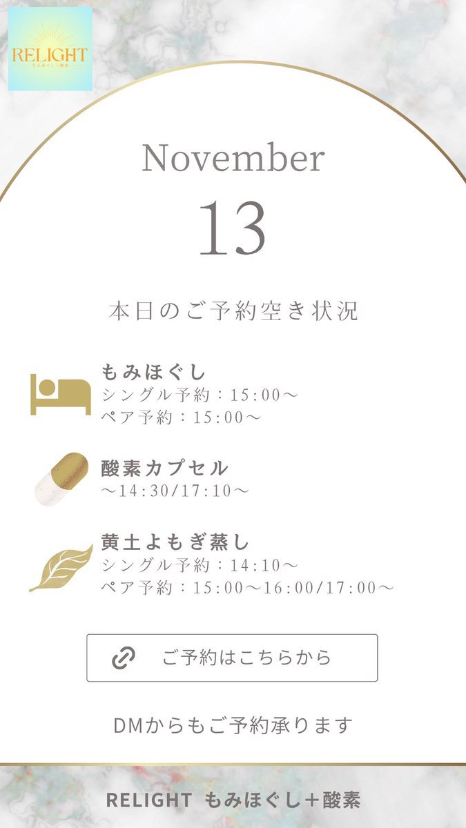 🗓【本日の空き状況】 週末のご褒美に✨RELIGHTへ🎁 高田馬場・西早稲田で疲れた心と体をリセット💆‍♀️ もみほぐし・よもぎ蒸し・酸素カプセルなど充実◎ 🌐ご予約は下記URLから 🔗 x.gd/relight_coupon #西早稲田 #高田馬場 #もみほぐし #酸素カプセル #黄土よもぎ蒸し #小顔矯正 #完全個室サロン pic.x.com/hXEgUgj4a1