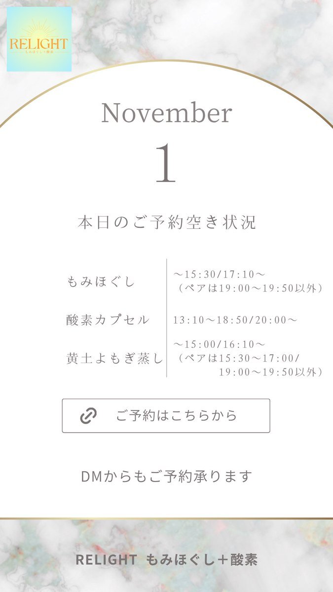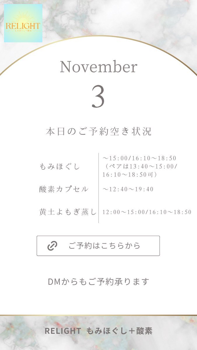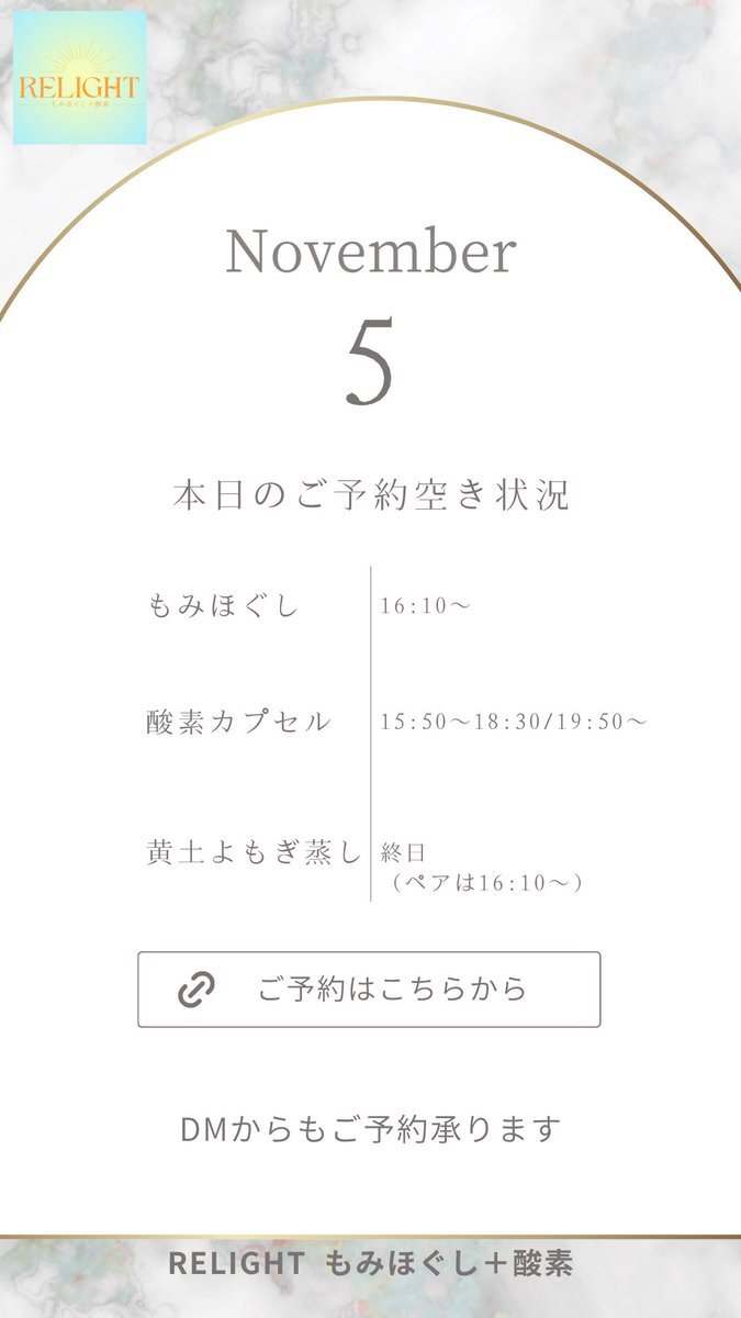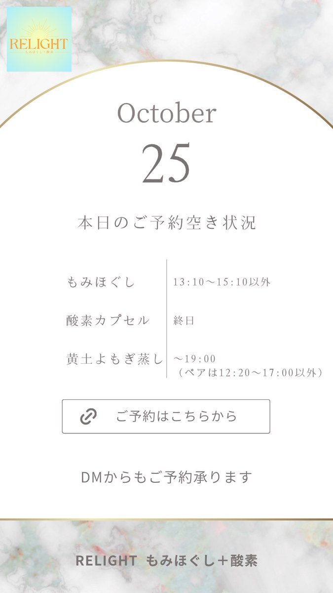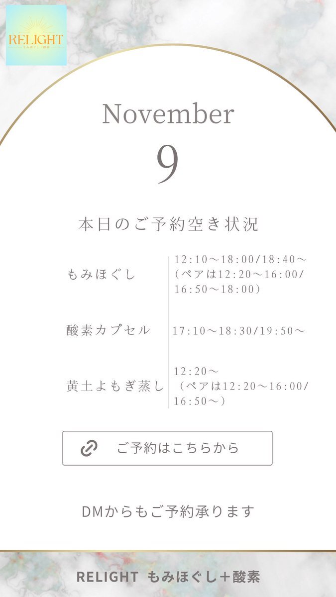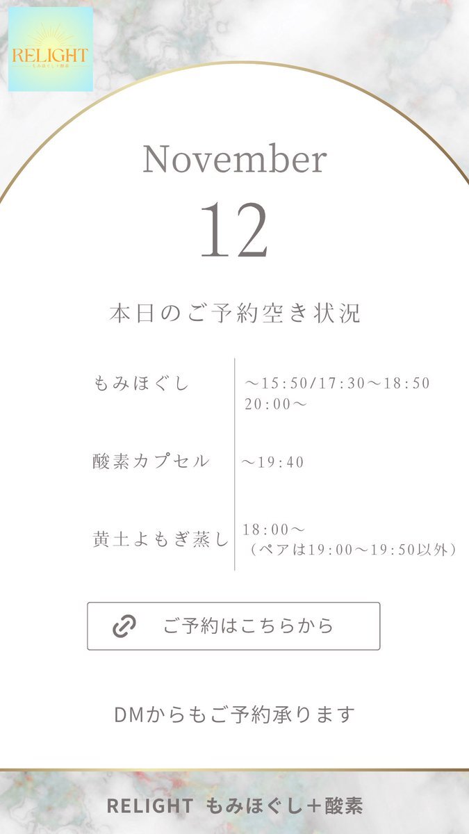 🗓【本日の空き状況】 週末のご褒美に✨RELIGHTへ🎁 高田馬場・西早稲田で疲れた心と体をリセット💆‍♀️ もみほぐし・よもぎ蒸し・酸素カプセルなど充実◎ 🌐ご予約は下記URLから 🔗 x.gd/relight_coupon #西早稲田 #高田馬場 #もみほぐし #酸素カプセル #黄土よもぎ蒸し #小顔矯正 #完全個室サロン pic.x.com/hXEgUgj4a1