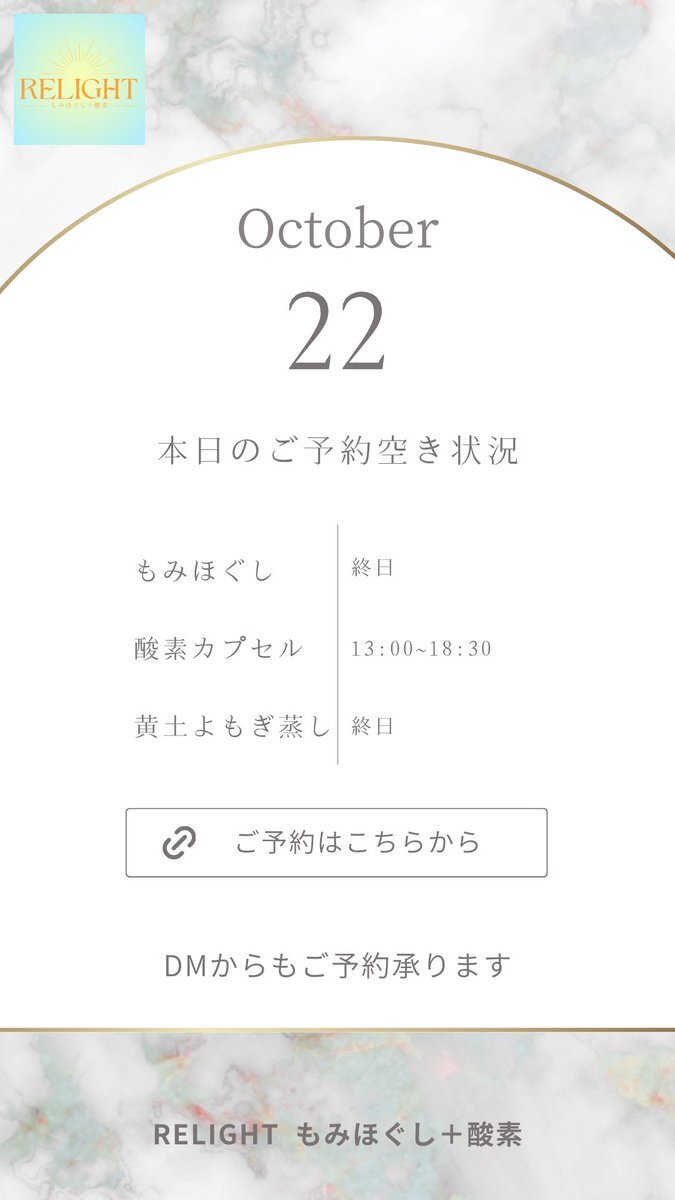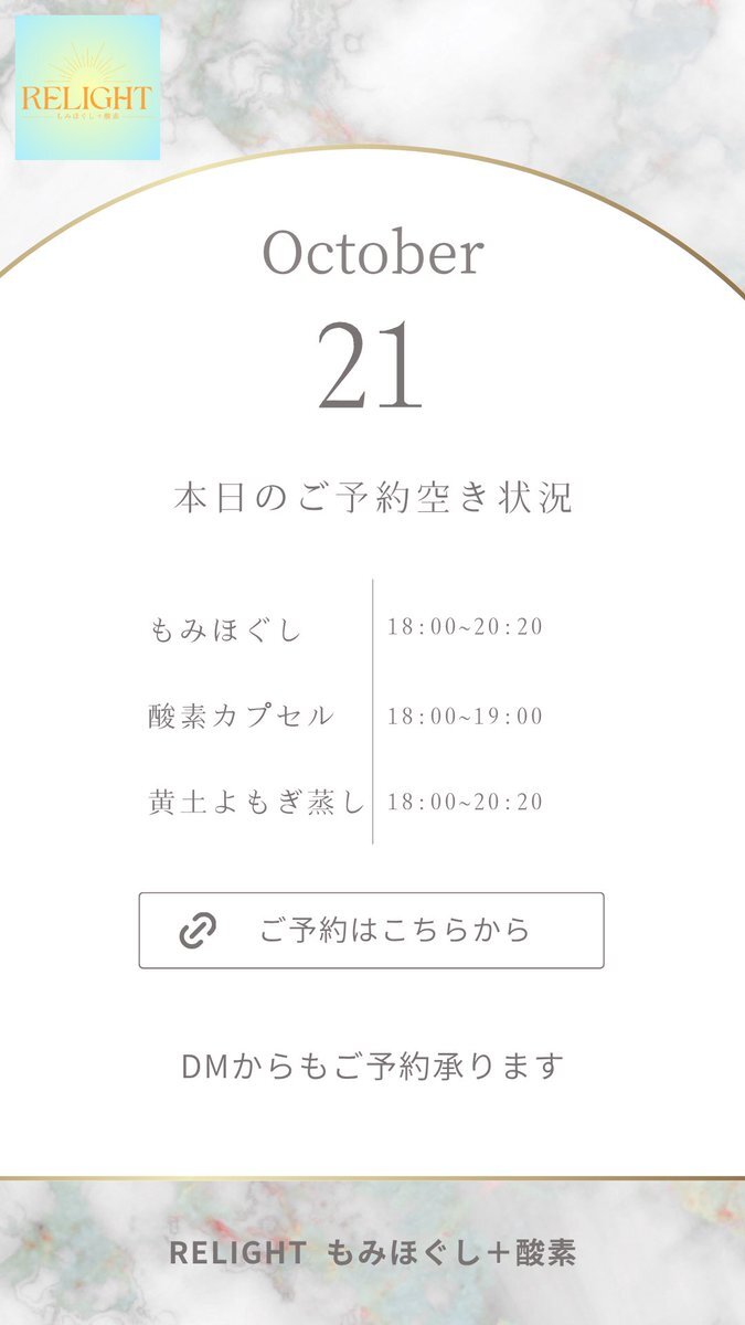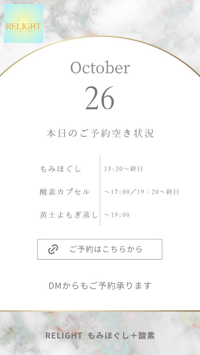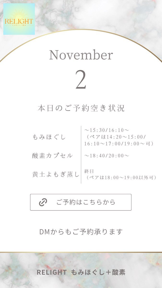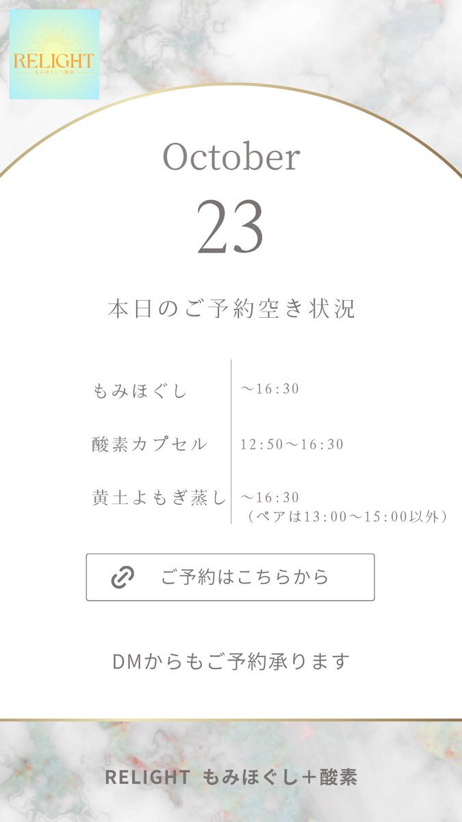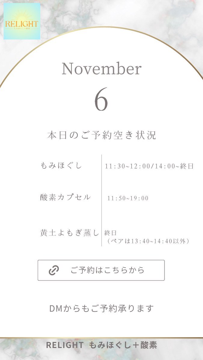 🗓【本日の空き状況】 週末のご褒美に✨RELIGHTへ🎁 高田馬場・西早稲田で疲れた心と体をリセット💆‍♀️ もみほぐし・よもぎ蒸し・酸素カプセルなど充実◎ 🌐ご予約は下記URLから 🔗 x.gd/relight_coupon #西早稲田 #高田馬場 #もみほぐし #酸素カプセル #黄土よもぎ蒸し #小顔矯正 #完全個室サロン pic.x.com/hXEgUgj4a1