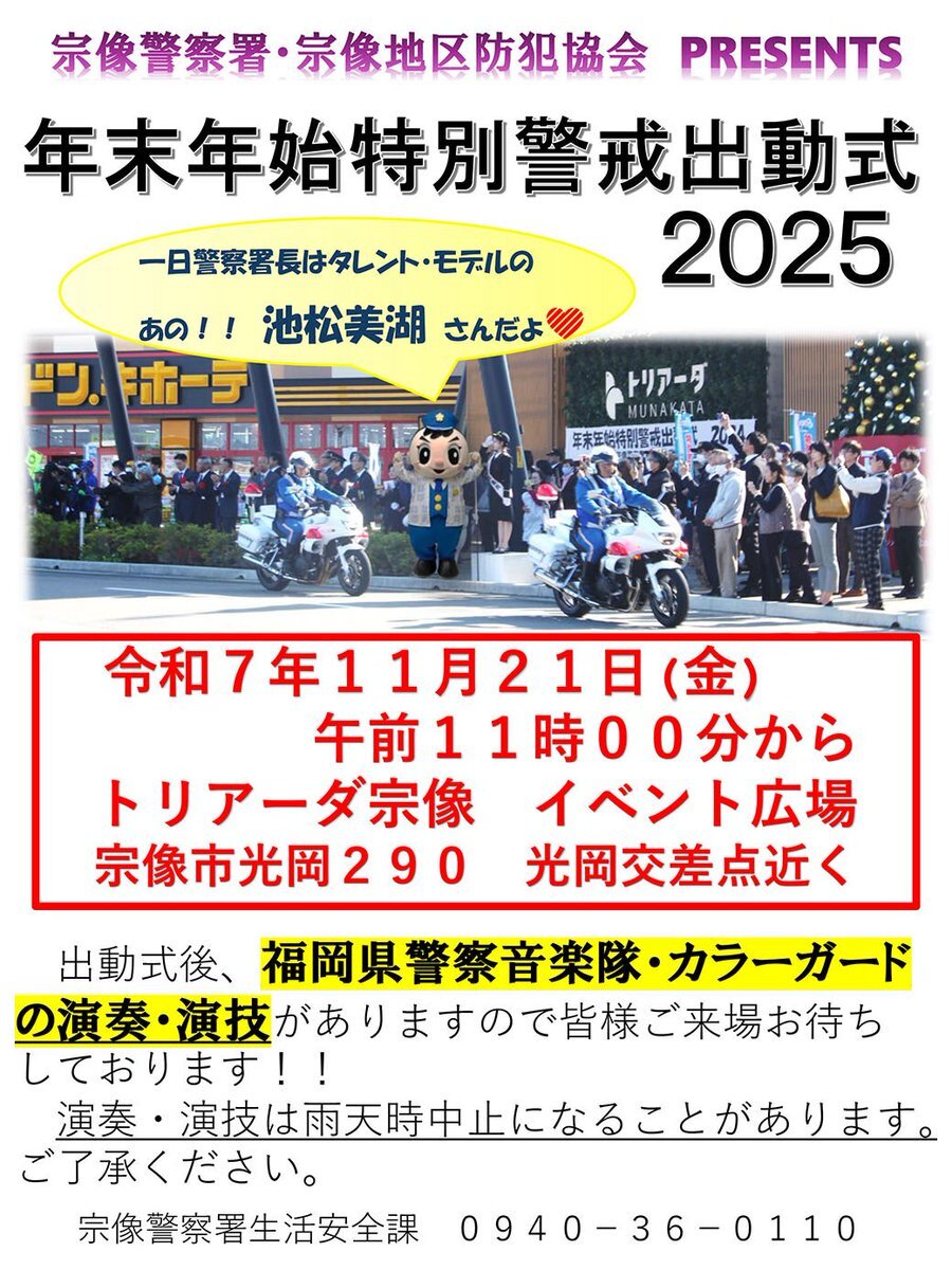 明日11月21日は警察イベント👮♀️✨ カッコいい警察のみなさんの演奏や演技が見れるんだ✨楽しみ〜✨ 平日やけどお時間のある方はぜひ見に来てね✨ #むなかたのテンちゃん🦑 #池松美湖 #ふっけい君 #たまピー #しぐまる #ふくふくちゃん #トリアーダ宗像 #宗像警察署 #いつも町を守ってくれてありがとう pic.x.com/mjVnNPGwDB
