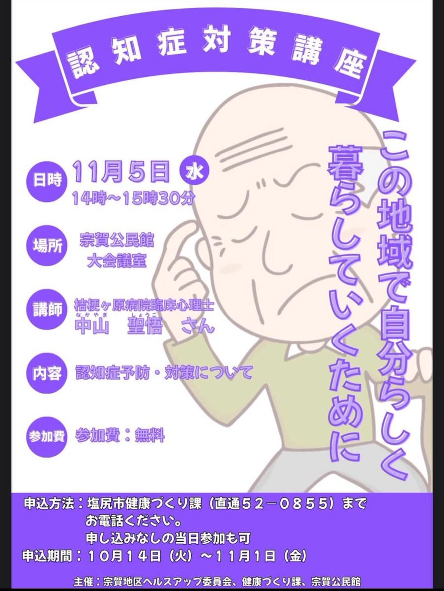 《講座案内》 11/5(水)#認知症対策講座 #桔梗ヶ原病院 中山先生が 認知症の対策と予防について講演をしてくださいます。発症リスクを下げるための事前の予防策や認知症との向き合い方を聞ける貴重な機会です。#参加費無料 ですのでお時間ある方は是非お越しください。 #宗賀公民館 #塩尻市健康づくり課 pic.x.com/4ljlX2ptrq