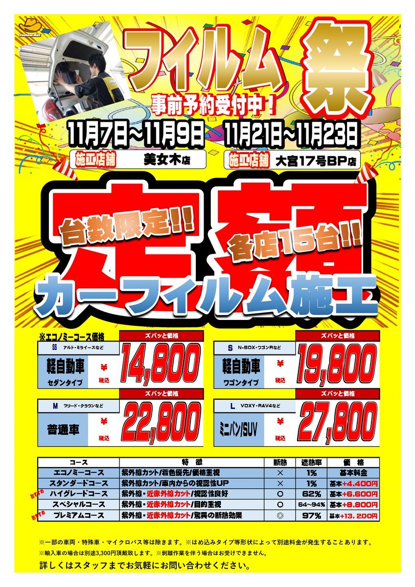 フィルム祭り開催♪ 美女木店は11月7日~11月9日まで、 カーフィルム施工がお得になりますっ! 台数限定です!😍 事前予約受付中で~す✨ ご予約は お早めにっ! #カーフィルム #スモーク #プライバシー保護 #フィルム貼り #定額 #イエローハット美女木店 pic.x.com/ygFgIiDpW9