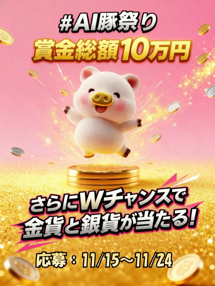 / 賞金総額10万円✨ 福ぶたの祭典 #AI豚祭り 開催!🏆 \ 幸せを呼ぶ福ぶた🐽大募集💫 優勝作品は企業公式キャラクターに採用🙋♀️ さらに! Wチャンスで金貨・銀貨をプレゼント🏅 応募は11月15日から24日まで! 詳細はリプ欄へ👇 #金貨銀貨のスペースインターナショナル