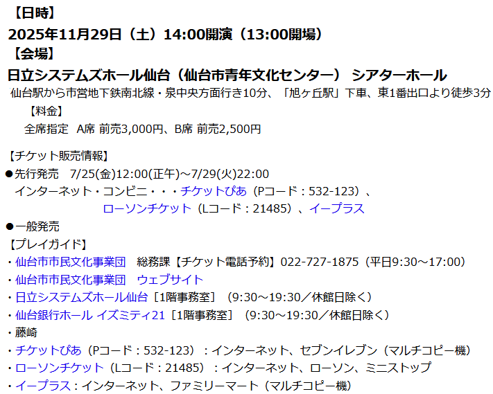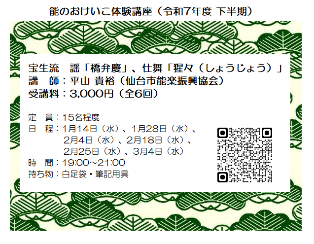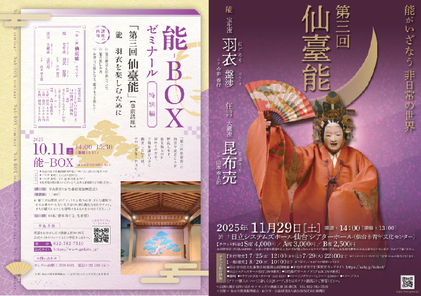 「市民能楽講座」は令和5年から 「仙臺能」に名称を改めました。 第3回は宝生流による能「羽衣(盤渉)」と 大蔵流による狂言「昆布売」です。 開催日:2025年11月29日(土) 開場:13時 開演:14時 会場:日立システムズホール仙台 #宝生流 #仙臺能 pic.x.com/tCAcq0m5xs