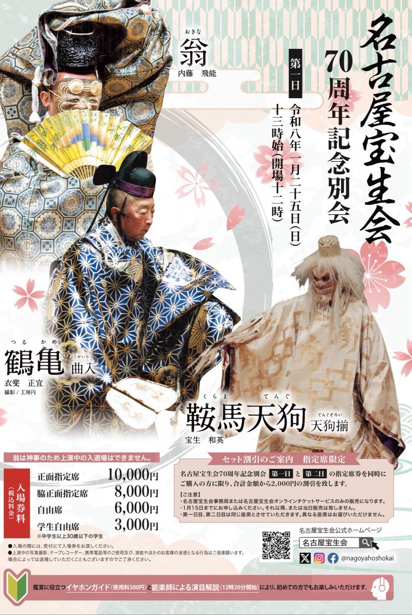 「名古屋宝生会70周年周年記念別会第一日目」令和8年1月25日(日)名古屋能楽堂 チラシが出来上がりました。チケットの販売も開始しておりますが、名古屋宝生会ホームページのチケット申込フォームの準備が追いついておりません。今しばらくお待ちください。#名古屋宝生会 #宝生流 pic.x.com/PkjUnpjUIp