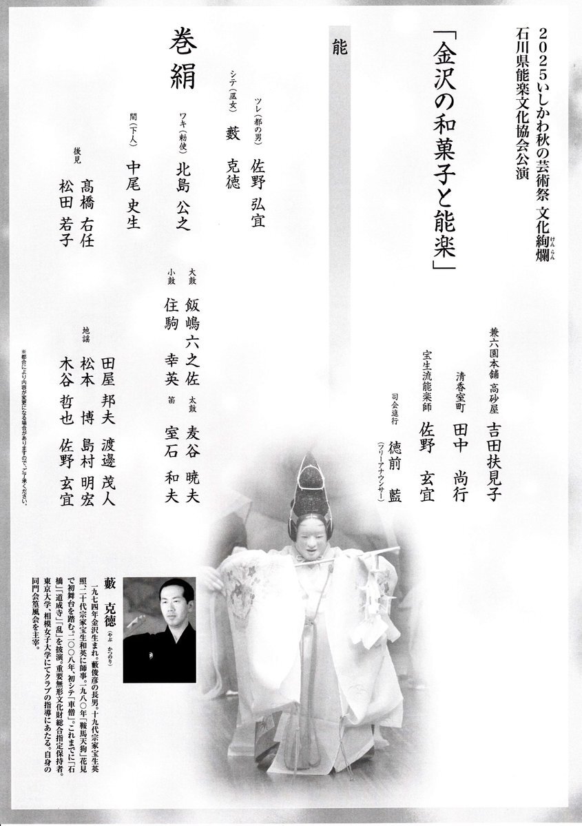 2025いしかわ秋の芸術祭 文化絢爛 石川県能楽文化協会公演 ⭐️金沢の能と和菓子⭐️ 11月16日(日)14:30開演 対談「金沢の和菓子と能楽」 能「巻絹」 藪 克徳 和菓子付チケット 一般:3,000円 小~大学生:2,000円 ※当日は各500円増し 詳しくは→noh-theater.jp/schedule/20251… #能 #能楽 #宝生流 #和菓子