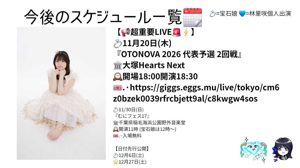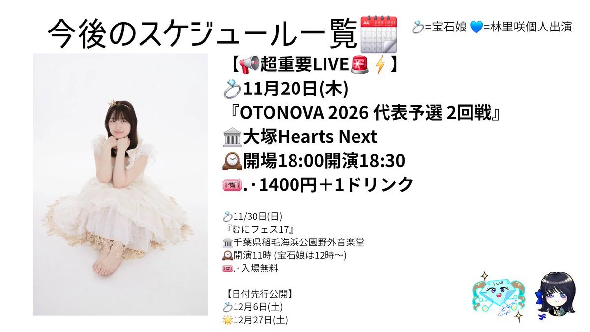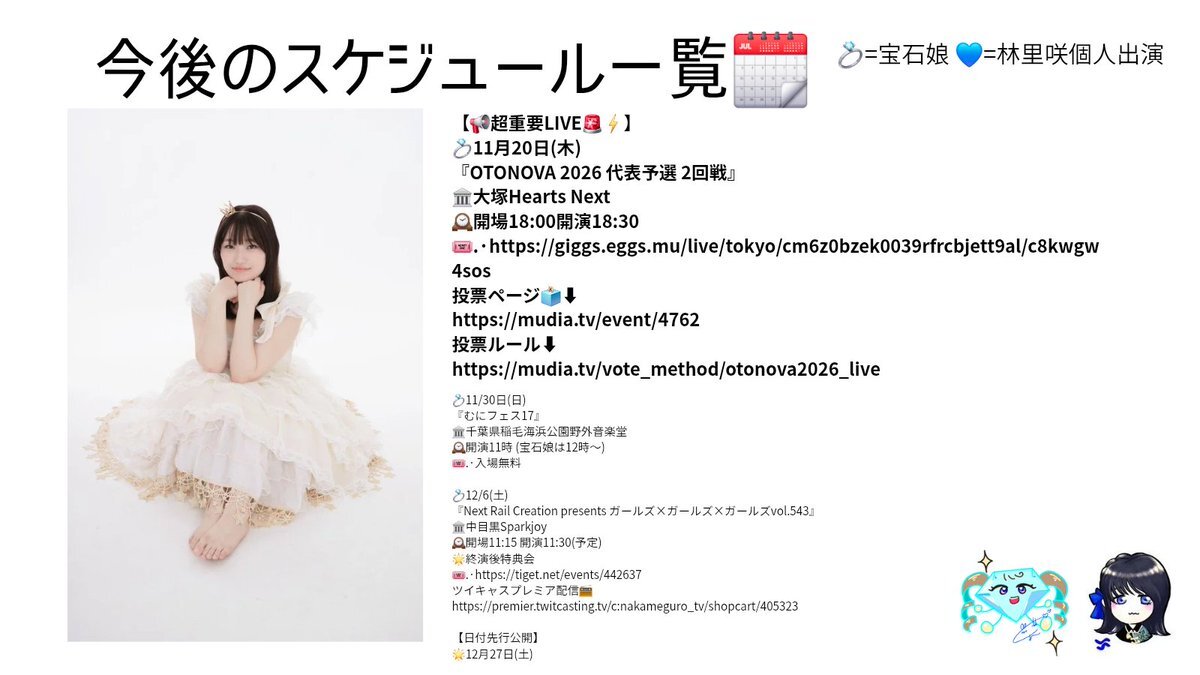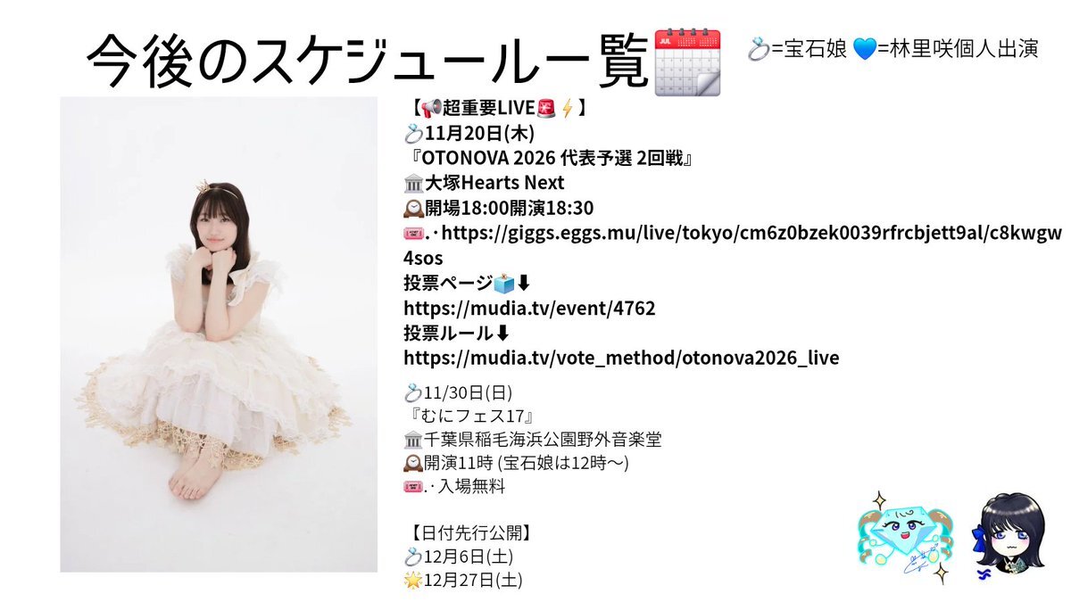 昨日お知らせ沢山しましたが、1番直近のライブは来週です!✨ 💍11月20日(木) 『OTONOVA 2026 代表予選 2回戦』 🏛大塚Hearts Next 🕰開場18:00開演18:30 🎟.·giggs.eggs.mu/live/tokyo/cm6… 投票ページ🗳⬇ mudia.tv/event/4762 投票ルール⬇ mudia.tv/vote_method/ot… #宝石娘 pic.x.com/S9mV5krxsO x.com/rinrin_risa884…