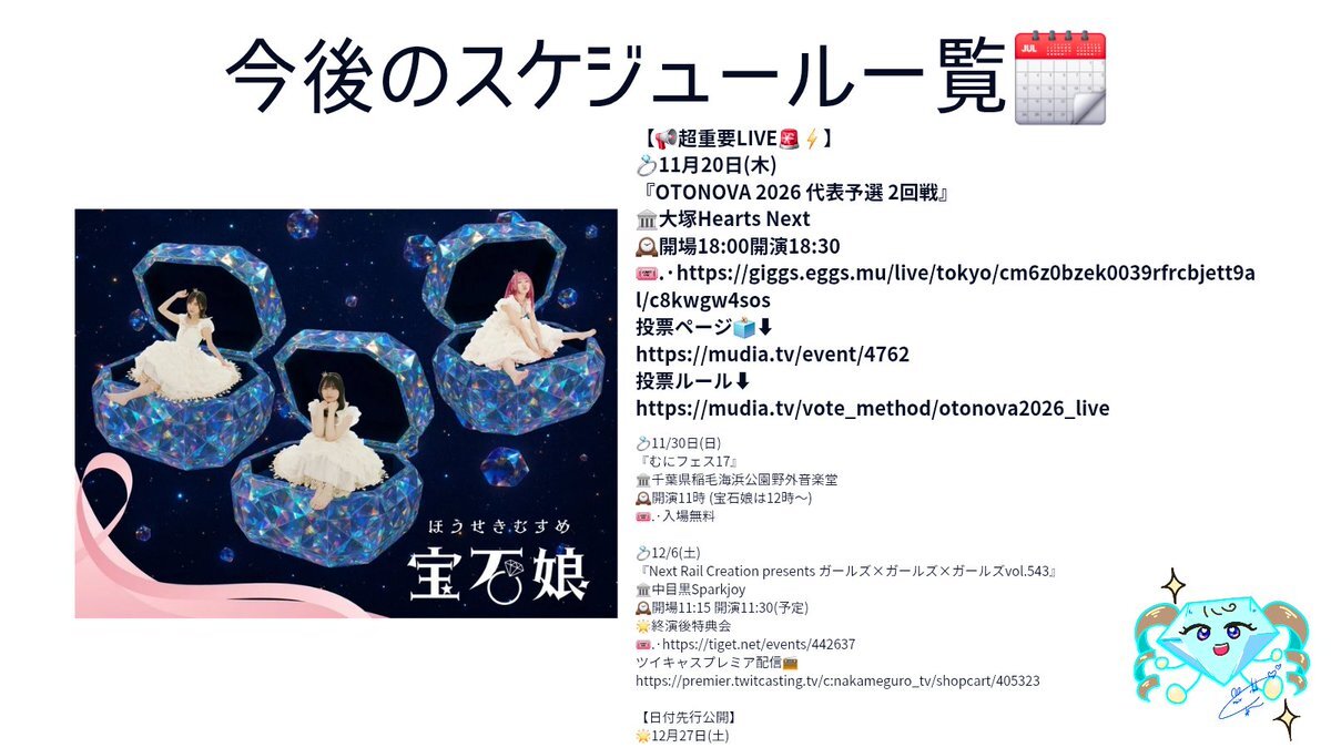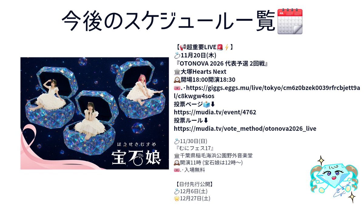 おはようございます️☀️.°とっても良いお天気〜 来週の大切なLIVEは⬇✨ 💍11月20日(木) 『OTONOVA 2026 代表予選 2回戦』 🏛大塚Hearts Next 🕰開場18:00開演18:30 🎟.·giggs.eggs.mu/live/tokyo/cm6… 投票ページ🗳⬇ mudia.tv/event/4762 投票ルール⬇ mudia.tv/vote_method/ot… #宝石娘