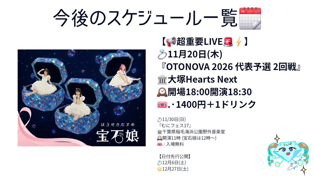【📢超重要LIVE🚨⚡】 💍11月20日(木) 『OTONOVA 2026 代表予選 2回戦』 🏛大塚Hearts Next 🕰開場18:00開演18:30 🎟.·1400円+1ドリンク 優勝するとメジャーデビュー!絶対絶対絶対会場で応援してください!!!🔥🔥 #宝石娘 pic.x.com/3FfHOWYwQ1
