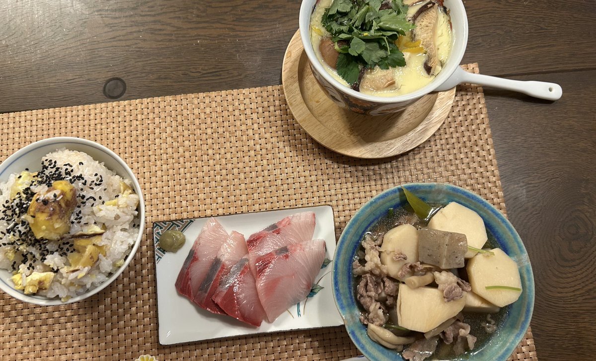 突発的ですが実家に呼ばれてそのままご飯となりました。ありがたや〜 芋煮と茶碗蒸しと栗ご飯! 大好きメニューが出てきてしっかり頂きました〜実家の犬が体力を持て余し大暴れするので、少し遊んで発散させてあげよーかと思います。#実家ごはん pic.x.com/jnt3GIt64U