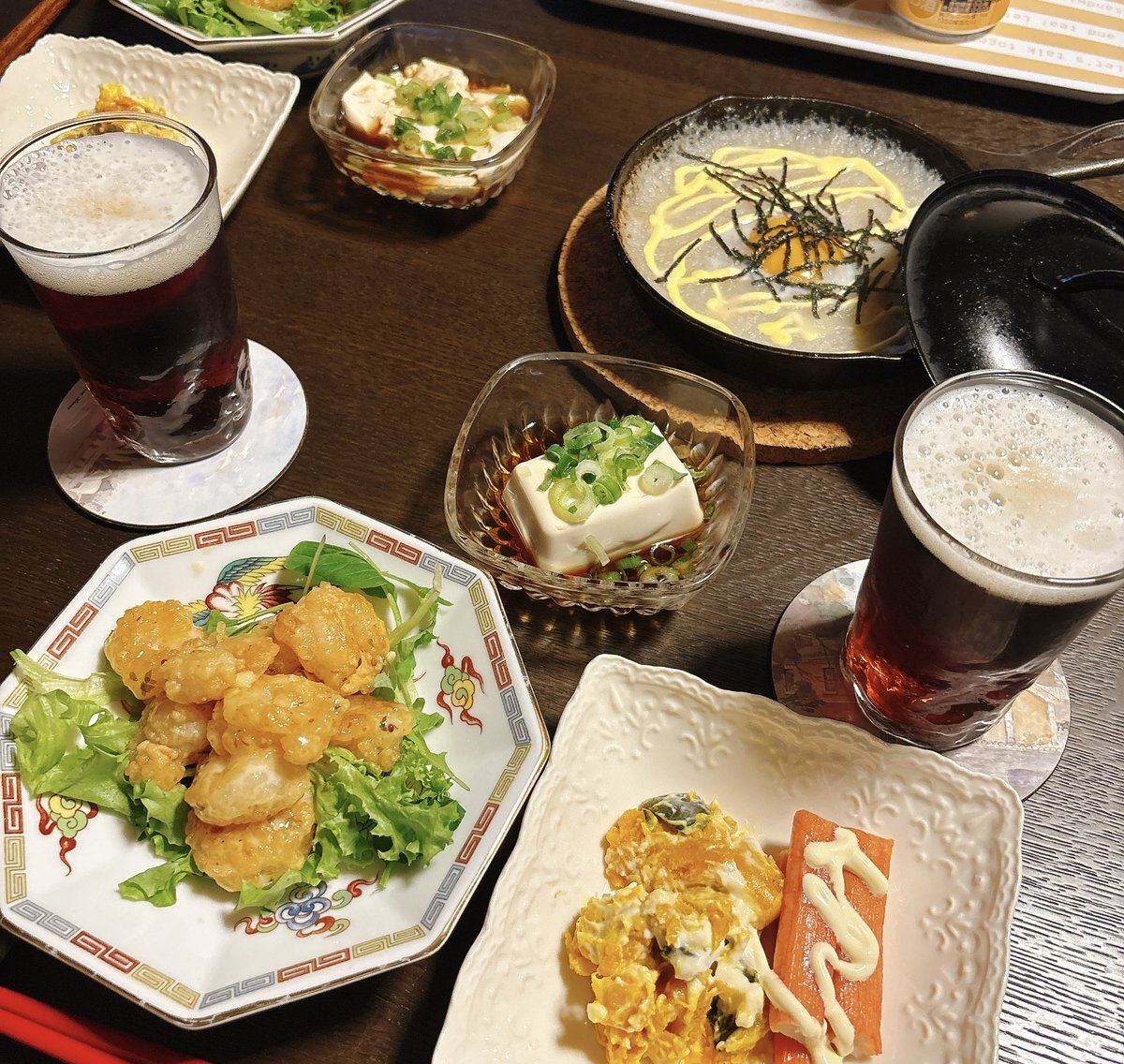 夜になると寒い 帰りGジャンじゃ寒そ~💦🚃𓈒𓂂𓏸 ♡エビマヨ ♡かぼちゃサラダ ♡山芋鳥貴族風 ♡温奴 ♡マルエフ黒生ハーフandハーフ いただきます🙏 #ばんごはん #実家ごはん #料理記録 pic.x.com/JKUismqSyB