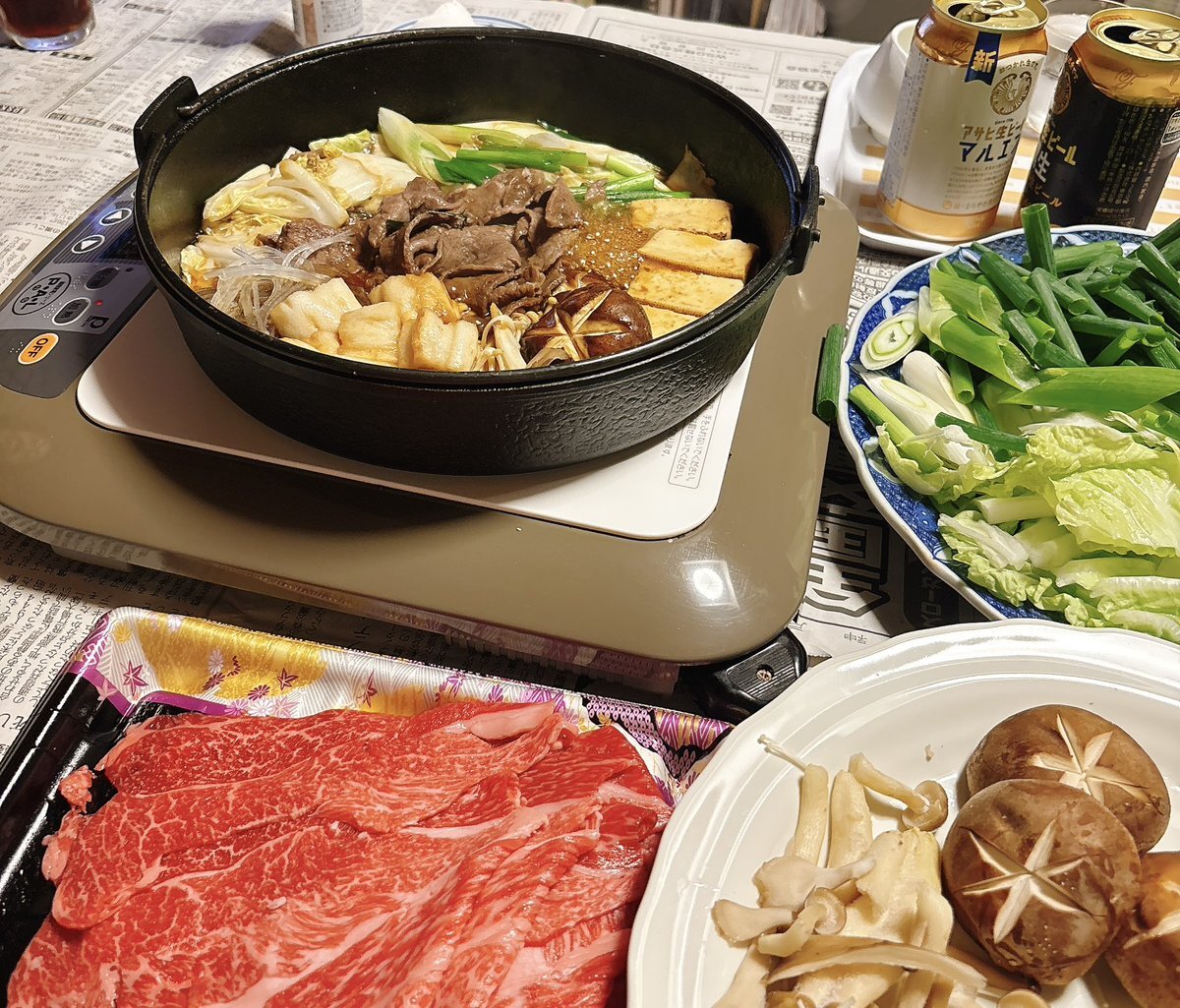 土曜日お疲れ様でした😊 仕事終わり実家に来たら😍 ♡すき焼き~松坂牛 ♡マルエフ黒生ハーフandハーフ かんぱーい🍻 #ばんごはん #実家ごはん #すき焼き #料理記録 pic.x.com/Rprnq9sQYz