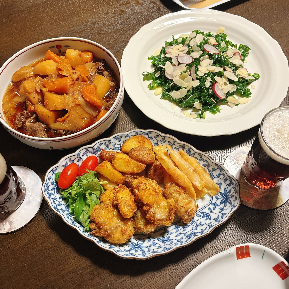 よく降りますね☔️ 実家ごはん ♡肉じゃが ♡フグの唐揚げ ♡ケールのチーズナッツサラダ ♡マルエフ黒生ハーフandハーフ かんぱーい🍻 #ばんごはん #実家ごはん #料理記録 pic.x.com/HBvKoVLoeK