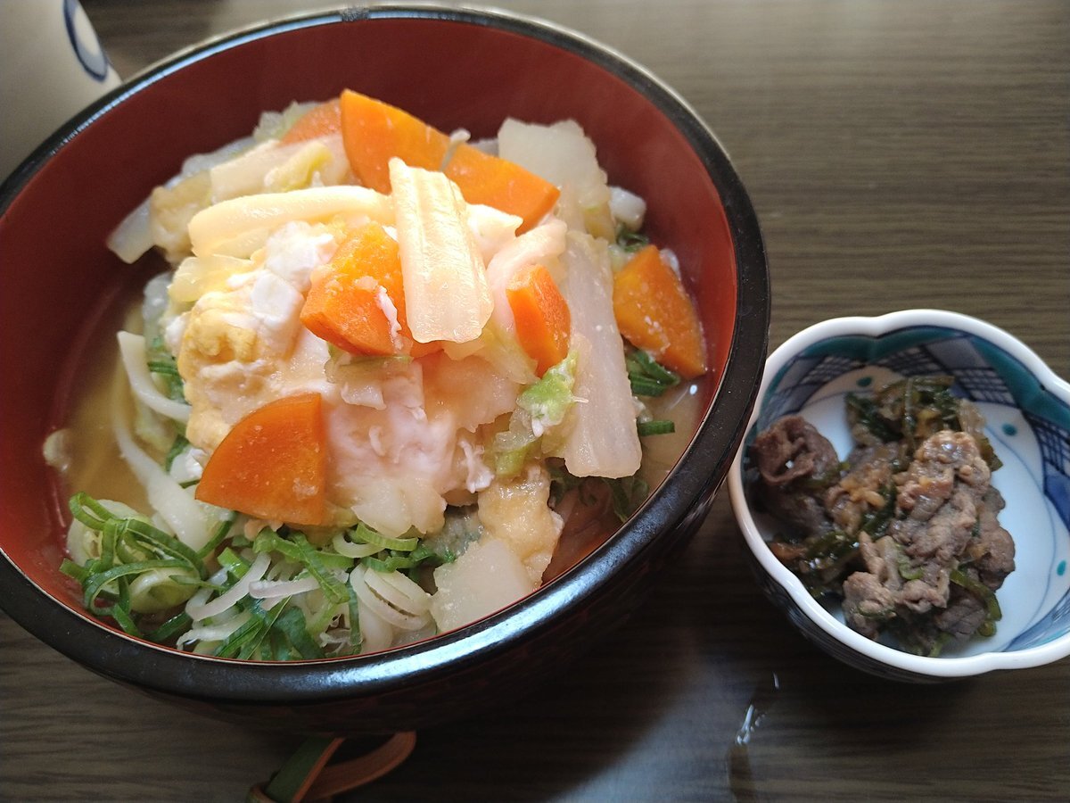 お昼ごはん。 煮込み味噌うどん… 野菜が多すぎてうどん見えない。 白菜1/8入ってる。 隣の小皿は牛肉とニンニクの煮たらうまか炒め❤️ 本当に便利。 #煮たらうまか は炒めでも胡麻和えでも美味しくできます😋 562kcal #昼ごはん #食事記録 #実家ごはん pic.x.com/M8VnIPgRpM