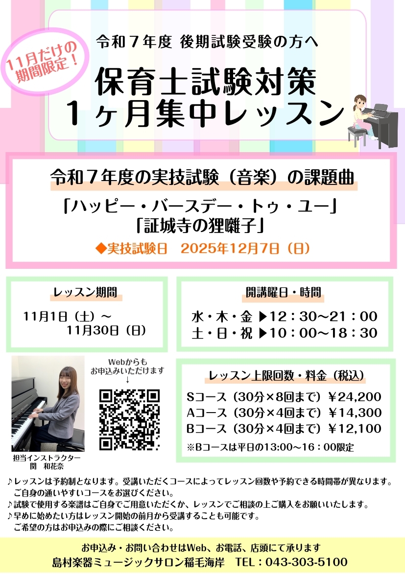 【 #保育士試験 】 12月7日(日)の実技試験へ向けた1ヶ月集中レッスンを期間限定で実施いたします! 🎂「ピアノ弾き語りに不安がある・・」 🐻「自信をもって試験に挑みたい!」 そんな方へ!✨ 早めの準備で一緒に合格を目指しましょう!㊗️ 🔻詳しくはコチラ🔻 himamura.co.jp/shop/ms-inage/…